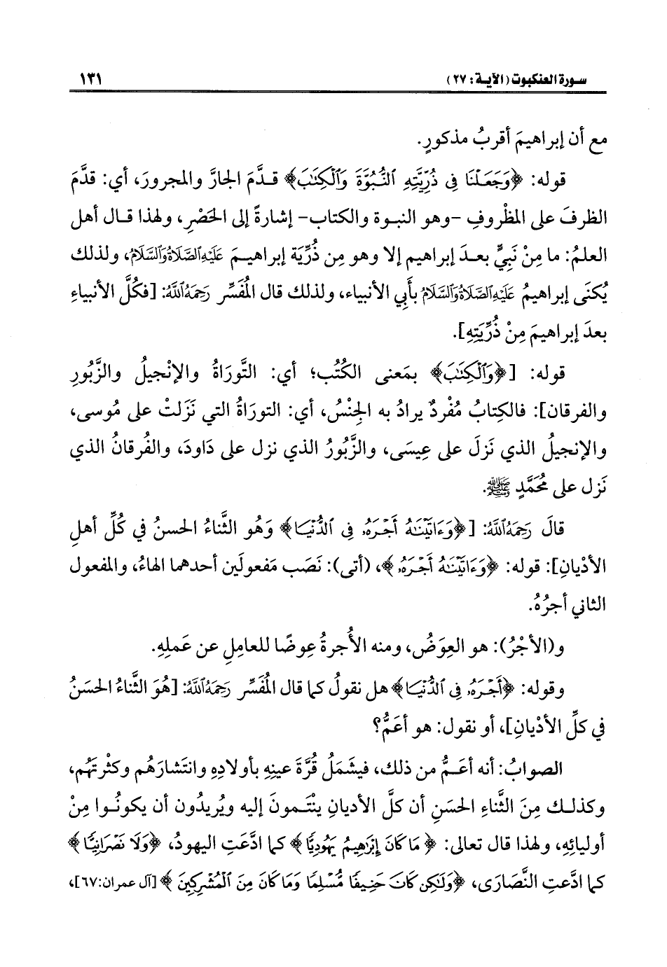قالَ رَحِمَهُ اللَّهُ: [{وَآتَيْنَاهُ أَجْرَهُ فِي الدُّنْيَا} وَهُو الثَّناءُ الحسنُ في كُلِّ أهلِ الأدْيانِ]: قوله: {وَآتَيْنَاهُ أَجْرَهُ}، (أتى): نَصَب مَفعولَين أحدهما الهاءُ، والمفعول الثاني أجرُهُ.