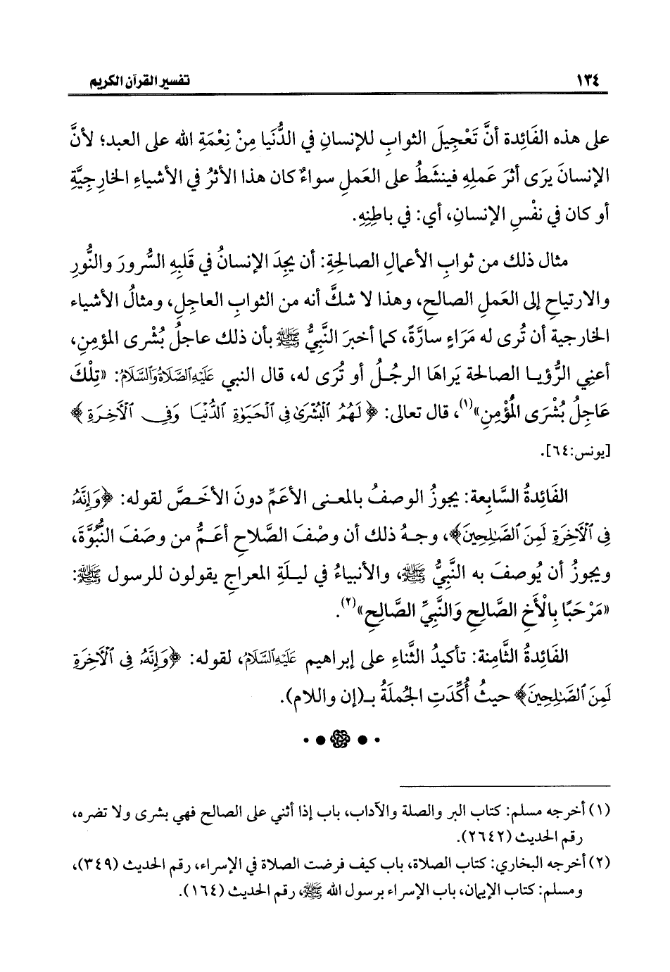 الفَائِدةُ السَّابِعة: يجوزُ الوصفُ بالمعنى الأعَمِّ دونَ الأخَصَّ لقوله: {وَإِنَّهُ فِي الْآخِرَةِ لَمِنَ الصَّالِحِينَ}، وجهُ ذلك أن وصْفَ الصَّلاحِ أعَمُّ من وصَفَ النُّبُوَّةَ، ويجوزُ أن يُوصفَ به النَّبِيُّ -صلى اللَّه عليه وسلم-، والأنبياءُ في ليلَةِ المعراجِ يقولون للرسول -صلى اللَّه عليه وسلم-: "مَرْحَبًا بِالأَخِ الصَّالِحِ وَالنَّبِيِّ الصَّالِحِ" (¬٢).