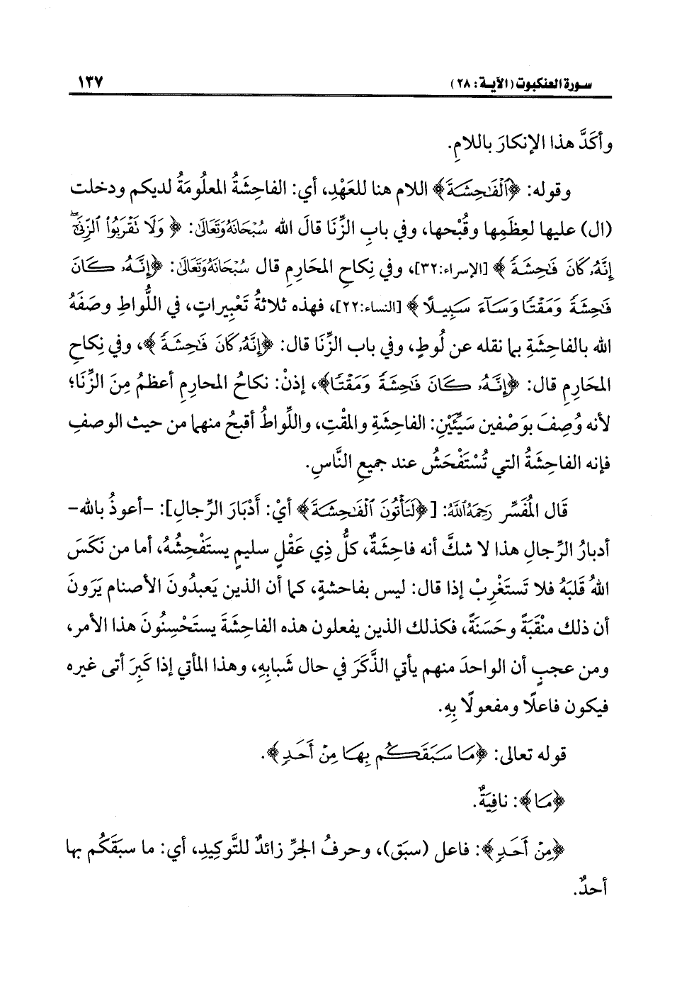 وقوله: {الْفَاحِشَةَ} اللام هنا للعَهْدِ، أي: الفاحِشَةُ المعلُومَةُ لديكم ودخلت (ال) عليها لعِظَمِها وقُبْحها، وفي بابِ الزِّنَا قالَ اللَّه سُبْحَانَهُ وَتَعَالَى: {وَلَا تَقْرَبُوا الزِّنَا إِنَّهُ كَانَ فَاحِشَةً وَسَاءَ سَبِيلًا} [الإسراء: ٣٢]، وفي نِكاحِ المحَارِمِ قال سُبْحَانَهُ وَتَعَالَى: {إِنَّهُ كَانَ فَاحِشَةً وَمَقْتًا وَسَاءَ سَبِيلًا} [النساء: ٢٢]، فهذه ثلاثةُ تَعْبِيراتٍ، في اللُّواطِ وصَفَهُ اللَّه بالفاحِشَةِ بما نقله عن لُوطٍ، وفي باب الزِّنَا قال: {إِنَّهُ كَانَ فَاحِشَةً}، وفي نِكاحِ المحَارِمِ قال: {إِنَّهُ كَانَ فَاحِشَةً وَمَقْتًا}، إذنْ: نكاحُ المحارِمِ أعظمُ مِنَ الزِّنَا؛ لأنه وُصِفَ بوَصْفين سَيِّئَيْنِ: الفاحِشَةِ والمقْتِ، واللِّواطُ أقبحُ منهما من حيث الوصفِ فإنه الفاحِشَةُ التي تُسْتَفْحَشُ عند جميعِ النَّاسِ.