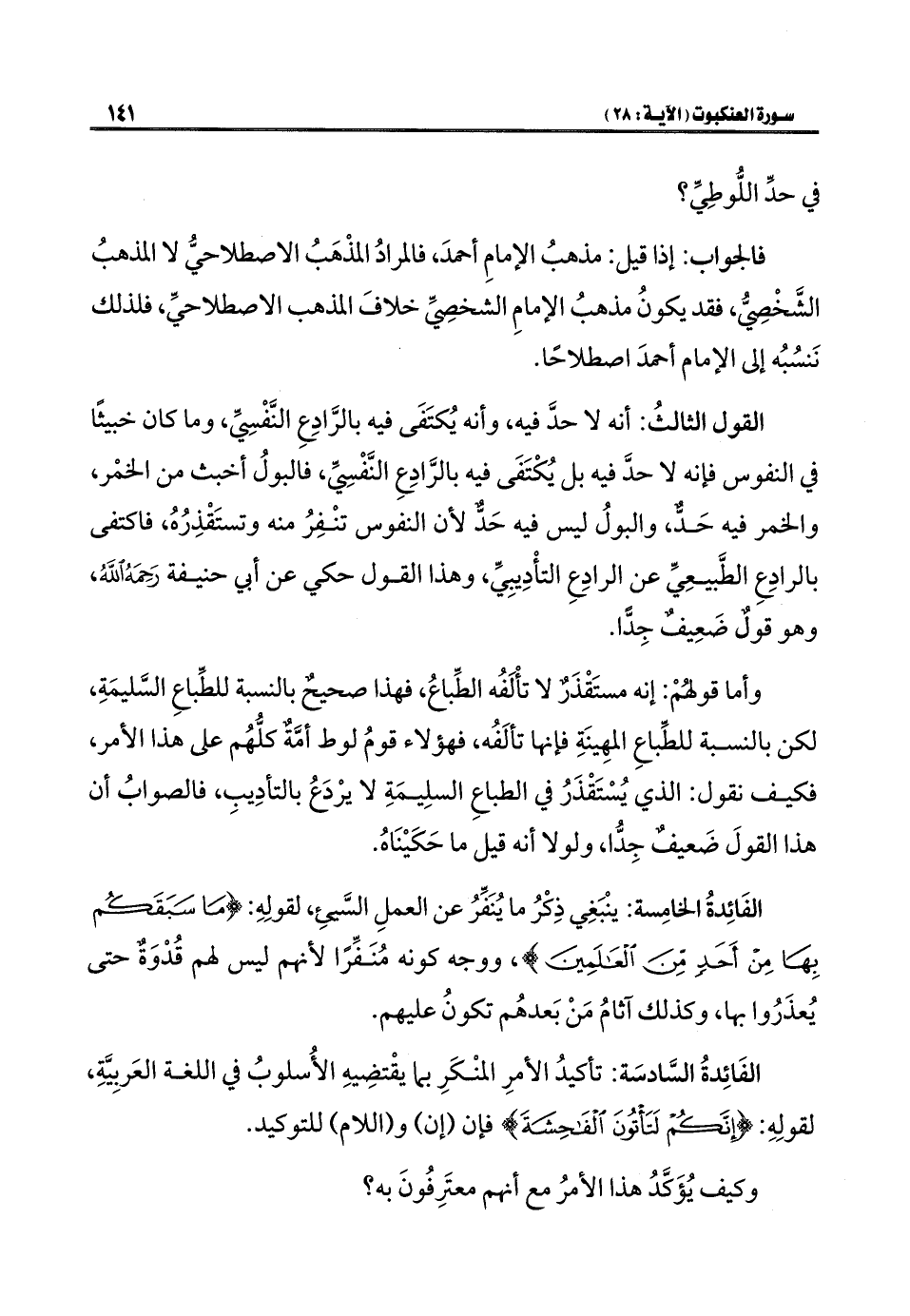 الفَائِدةُ السَّادسَة: تأكيدُ الأمرِ المنْكَرِ بما يقْتضِيهِ الأُسلوبُ في اللغة العَربِيَّةِ، لقولِهِ: {إِنَّكُمْ لَتَأْتُونَ الْفَاحِشَةَ} فإن (إن) و (اللام) للتوكيد.