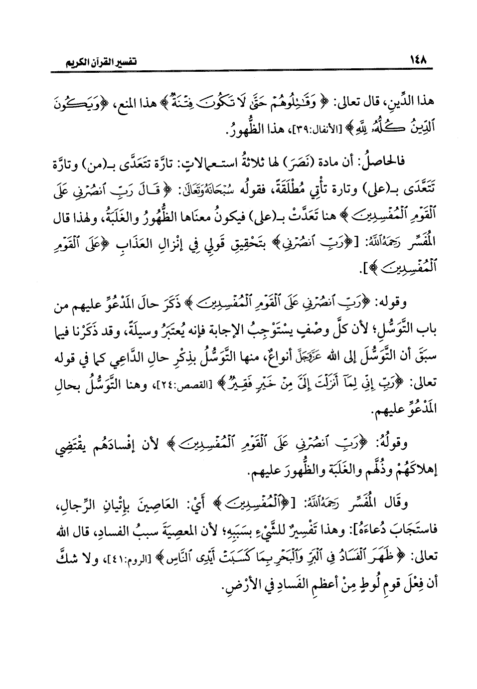 وقولُهُ: {رَبِّ انْصُرْنِي عَلَى الْقَوْمِ الْمُفْسِدِينَ} لأن إفْسادَهُم يقْتَضِي إهلاكَهُمْ وذُلَّهم والغَلَبَة والظُّهورَ عليهم.