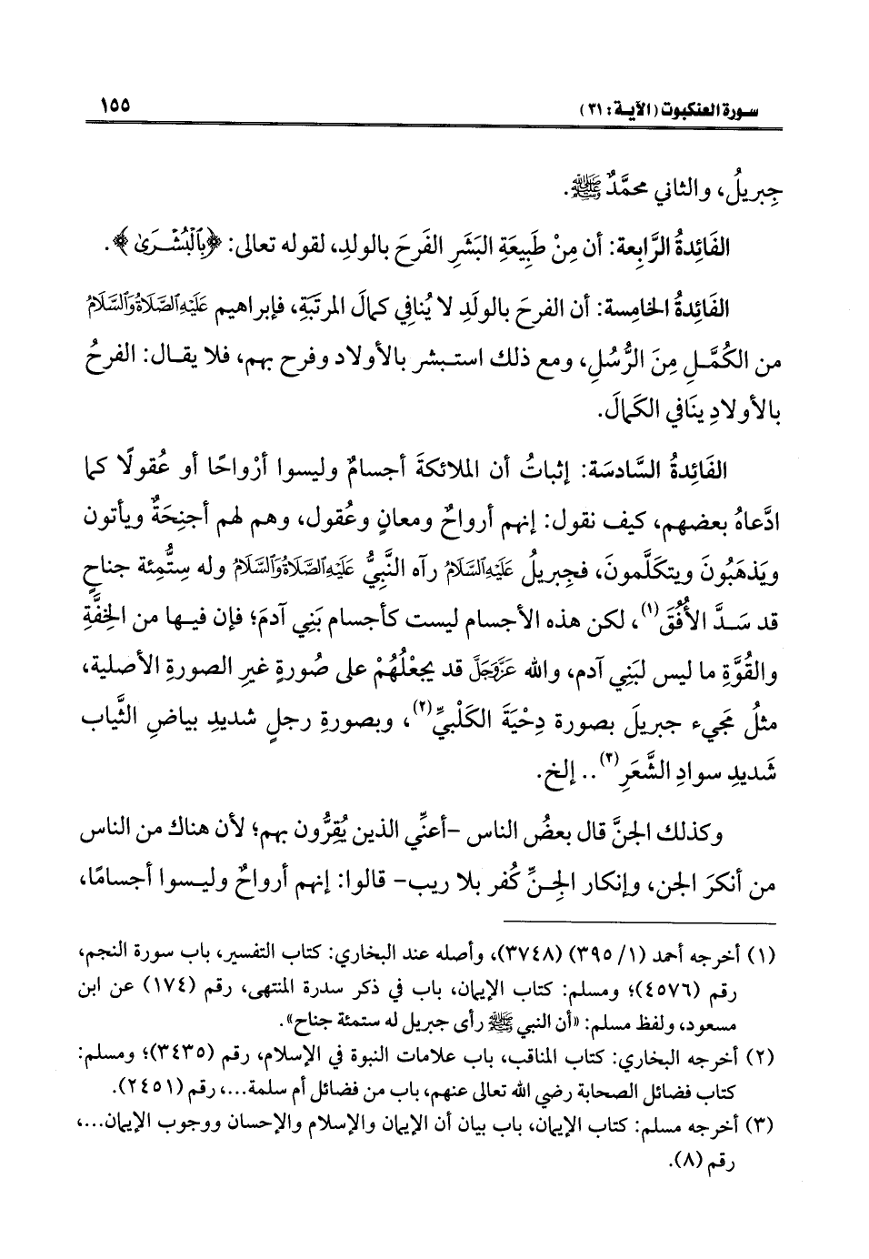الفَائِدةُ السَّادسَة: إثباتُ أن الملائكةَ أجسامٌ وليسوا أرْواحًا أو عُقولًا كلما ادَّعاهُ بعضهم، كيف نقول: إنهم أرواحٌ ومعانٍ وعُقول، وهم لهم أجنِحَةٌ ويأتون ويَذهَبُونَ ويتكَلَّمونَ، فجِبريلُ عَلَيْهِ السَّلَامُ رآه النَّبِيُّ عَلَيْهِ الصَّلَاةُ وَالسَّلَامُ وله سِتُّمِئة جناحٍ قد سَدَّ الأُفُقَ (¬١)، لكن هذه الأجسام ليست كأجسام بَنِي آدمَ؛ فإن فيها من الخِفَّةِ والقُوَّةِ ما ليس لبَنِي آدم، واللَّه عَزَّ وَجَلَّ قد يجعْلُهُمْ على صُورةٍ غير الصورةِ الأصلية، مثلُ مَجيء جبريلَ بصورة دِحْيَةَ الكَلْبيِّ (¬٢)، وبصورةِ رجل شديدِ بياضِ الثِّياب شَديدِ سوادِ الشَّعَرِ (¬٣). . إلخ.