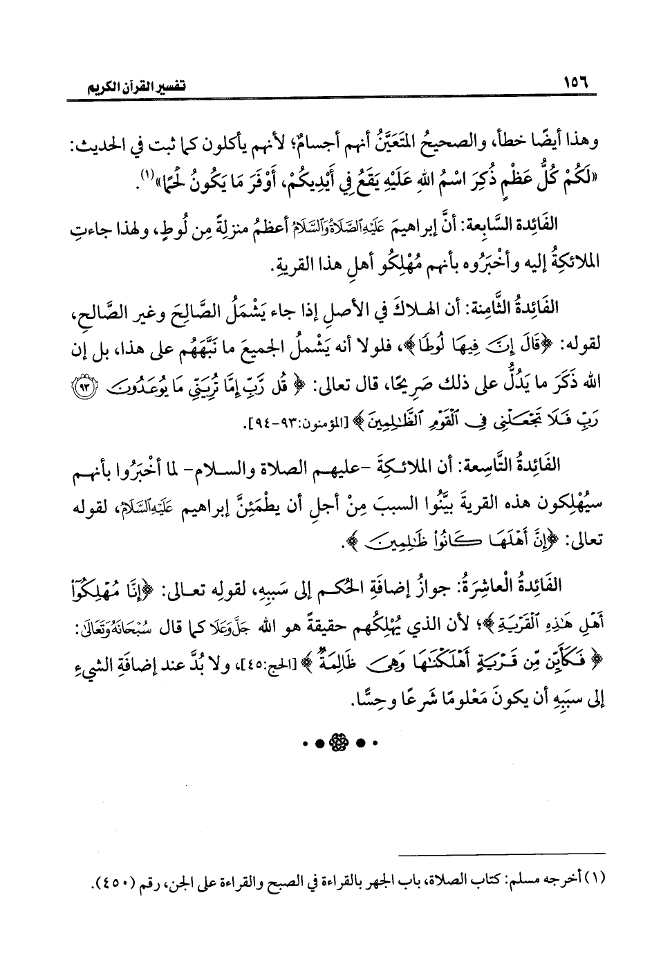 الفَائِدةُ الثَّامِنة: أن الهلاكَ في الأصلِ إذا جاء يَشْمَلُ الصَّالِحَ وغير الصَّالحِ، لقوله: {قَالَ إِنَّ فِيهَا لُوطًا}، فلولا أنه يَشْملُ الجميعَ ما نَبَّهَهُم على هذا، بل إن اللَّه ذَكَرَ ما يَدُلُّ على ذلك صَرِيحًا، قال تعالى: {قُلْ رَبِّ إِمَّا تُرِيَنِّي مَا يُوعَدُونَ (٩٣) رَبِّ فَلَا تَجْعَلْنِي فِي الْقَوْمِ الظَّالِمِينَ} [المؤمنون: ٩٣ - ٩٤].