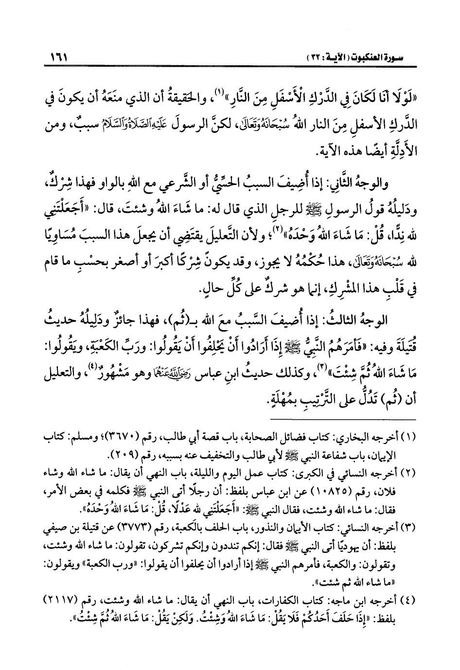 والوجهُ الثَّانِي: إذا أُضِيفَ السببُ الحسِّيُّ أو الشَّرعي مع اللَّهِ بالواو فهذا شِرْكٌ، ودَليلُهُ قولُ الرسولِ -صلى اللَّه عليه وسلم- للرجلِ الذي قال له: ما شَاءَ اللَّهُ وشئتَ، قال: "أَجَعَلْتَنِي للَّه نِدًّا، قُلْ: مَا شَاءَ اللَّهُ وَحْدَهُ" (¬٢)؛ ولأن التَّعليلَ يقتَضِي أن يجعلَ هذا السببَ مُسَاوِيًا للَّه سُبْحَانَهُ وَتَعَالَى، هذا حُكْمُهُ لا يجوز، وقد يكون شِرْكًا أكبرَ أو أصغر بحسْبِ ما قام في قَلْبِ هذا المشْرِكِ، إنما هو شركٌ على كُلِّ حالٍ.