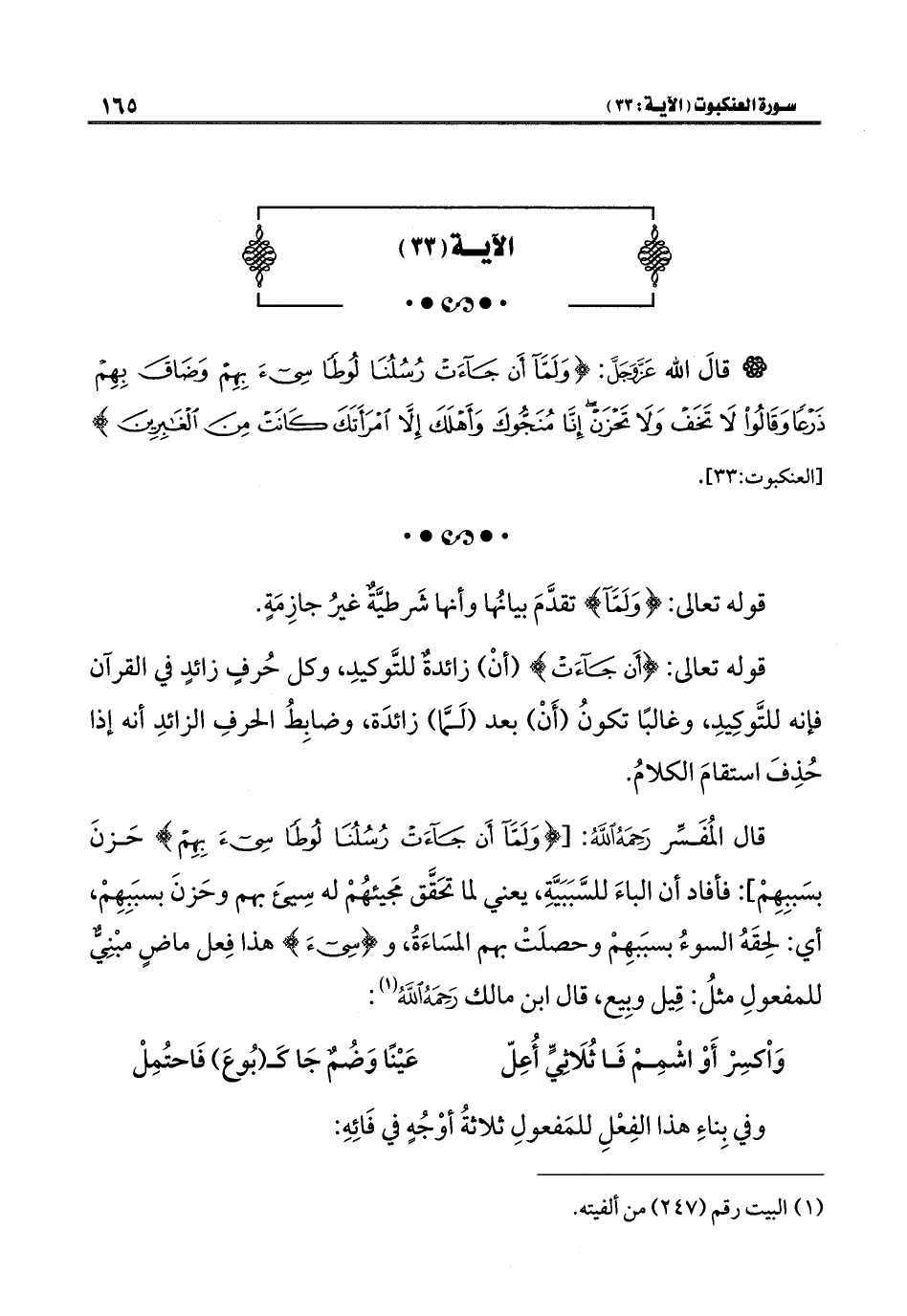 قال المُفَسِّر رَحِمَهُ اللَّهُ: [{وَلَمَّا أَنْ جَاءَتْ رُسُلُنَا لُوطًا سِيءَ بِهِمْ} حَزنَ بسَببِهِمْ]: فأفاد أن الباءَ للسَّبَبَيَّةِ، يعني لما تحَقَّق مجَيئهُمْ له سِيئَ بهم وحَزنَ بسبَبِهِمْ، أي: لحِقَهُ السوءُ بسبَبهِمْ وحصلَتْ بهم المسَاءَةُ، و {سِيءَ} هذا فِعل ماضٍ مبْنِيٌّ للمفعولِ مثلُ: قِيل وبِيع، قال ابن مالك رَحِمَهُ اللَّهُ (¬١):