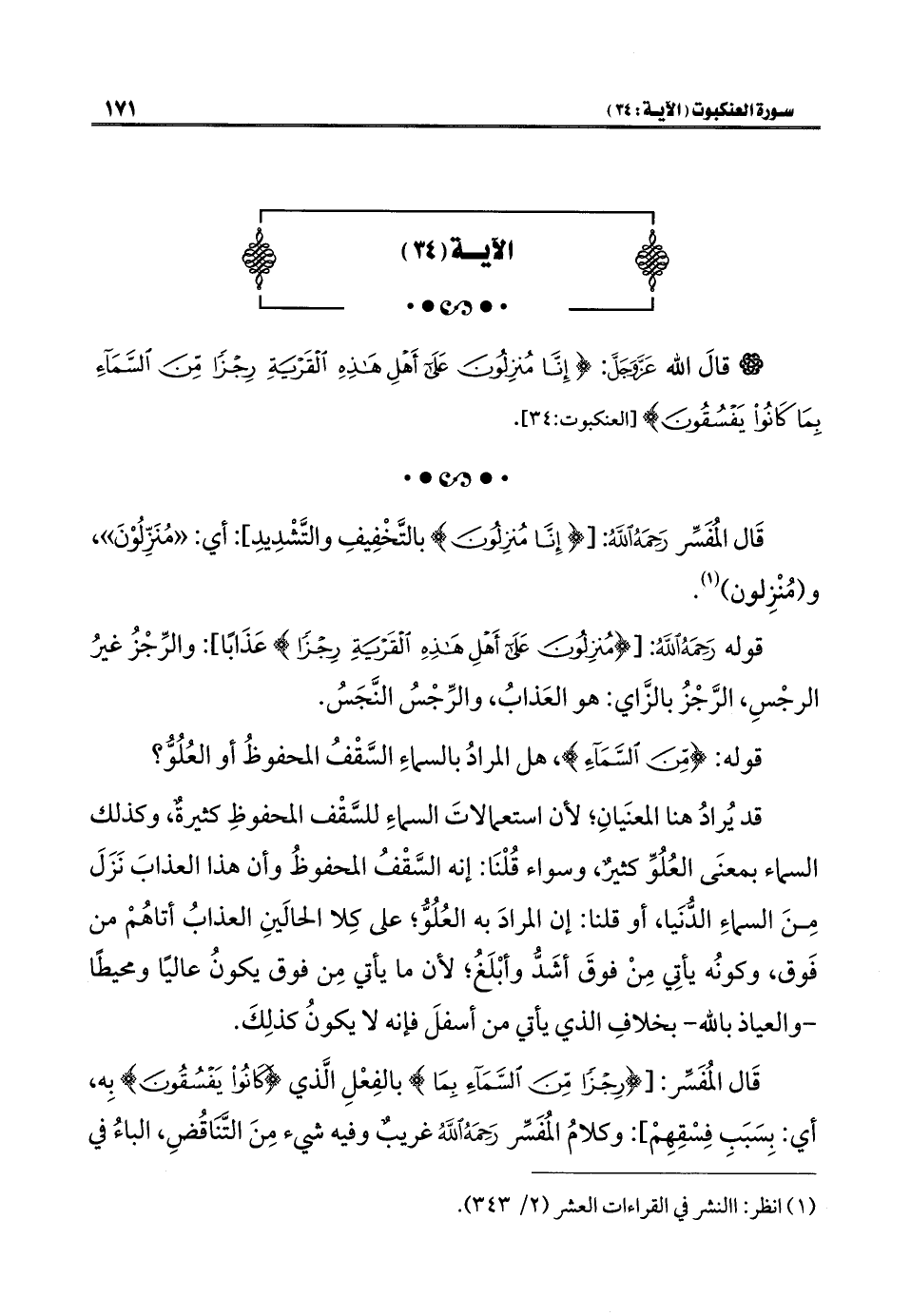 قوله رَحِمَهُ اللَّهُ: [{مُنْزِلُونَ عَلَى أَهْلِ هَذِهِ الْقَرْيَةِ رِجْزًا} عَذَابًا]: والرِّجْزُ غيرُ الرجْسِ، الرَّجْزُ بالزَّاي: هو العَذابُ، والرِّجْسُ النَّجَسُ.