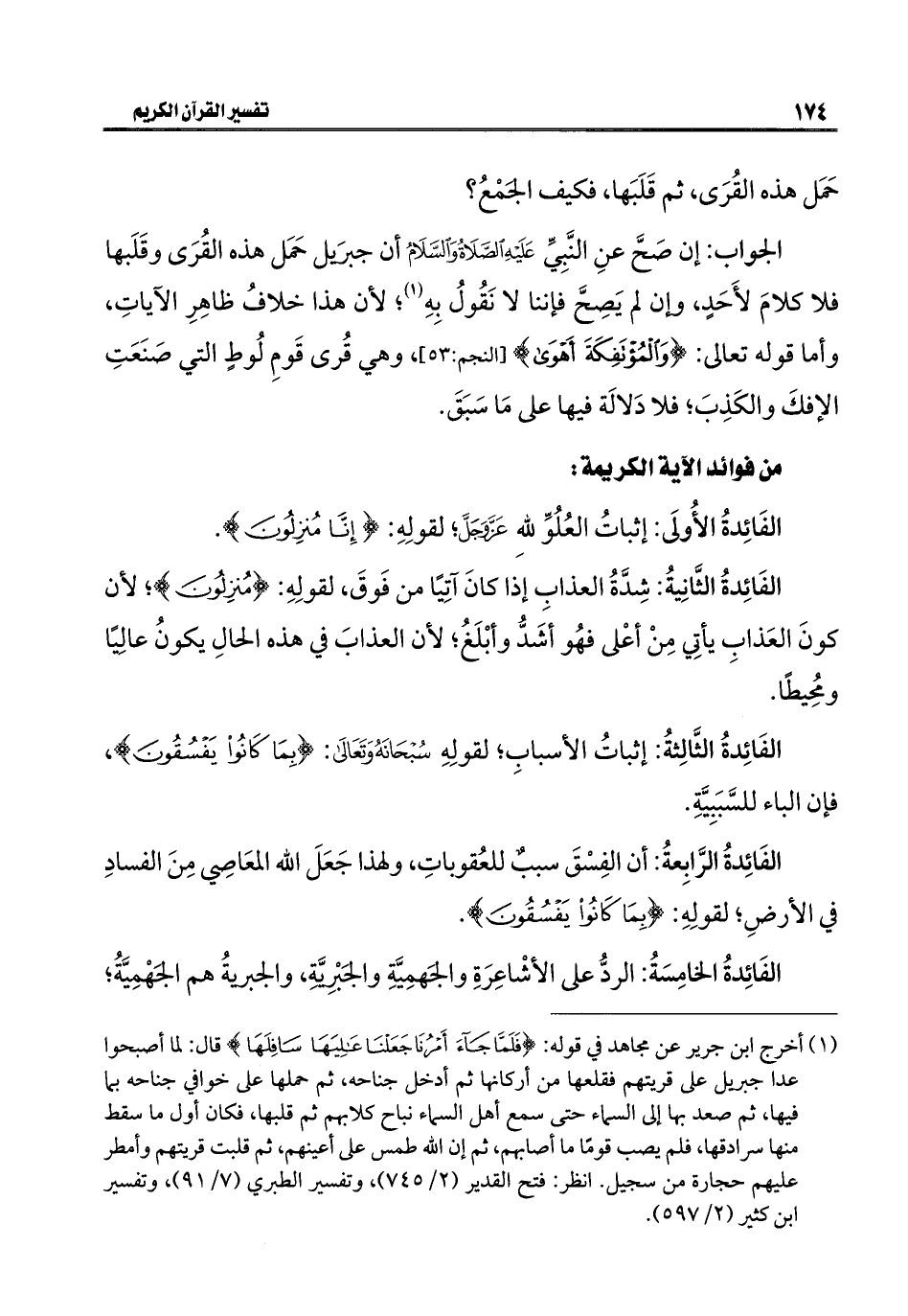 الجواب: إن صَحَّ عنِ النَّبِيِّ عَلَيْهِ الصَّلَاةُ وَالسَّلَامُ أن جبريل حَمَل هذه القُرَى وقَلَبها فلا كلامَ لأَحَدٍ، وإن لم يَصِحَّ فإننا لا نَقُولُ بِهِ (¬١)؛ لأن هذا خلافُ ظاهِرِ الآياتِ، وأما قوله تعالى: {وَالْمُؤْتَفِكَةَ أَهْوَى} [النجم: ٥٣]، وهي قُرى قَومِ لُوطٍ التي صَنَعَتِ الإفكَ والكَذِبَ؛ فلا دَلالَة فيها على مَا سَبَقَ.