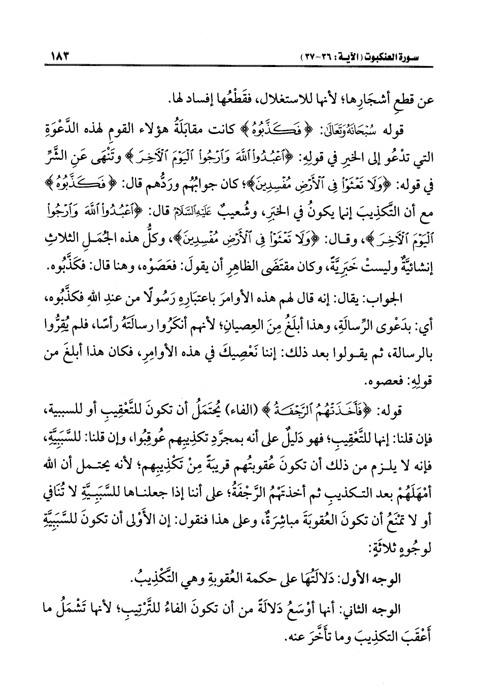 قوله سُبْحَانَهُ وَتَعَالَى: {فَكَذَّبُوهُ} كانت مقابَلَةُ هؤلاء القومِ لهذه الدَّعْوَةِ التي تدْعُو إلى الخيرِ في قولِهِ: {اعْبُدُوا اللَّهَ وَارْجُوا الْيَوْمَ الْآخِرَ} وتَنْهَى عَنِ الشَّرِّ في قوله: {وَلَا تَعْثَوْا فِي الْأَرْضِ مُفْسِدِينَ}؛ كان جوابُهُم ورَدُّهم قال: {فَكَذَّبُوهُ} مع أن التَّكذِيبَ إنما يكونُ في الخبَرِ، وشُعيبٌ عَلَيْهِ السَّلَامُ قال: {اعْبُدُوا اللَّهَ وَارْجُوا الْيَوْمَ الْآخِرَ}، وقال: {وَلَا تَعْثَوْا فِي الْأَرْضِ مُفْسِدِينَ}، وكلُّ هذه الجُمَلِ الثلاثِ إنشائيَّةٌ وليستْ خَبَرِيَّةً، وكان مقتَضَى الظاهِرِ أن يقولَ: فعَصَوْه، وهنا قال: فكَذَّبُوه.