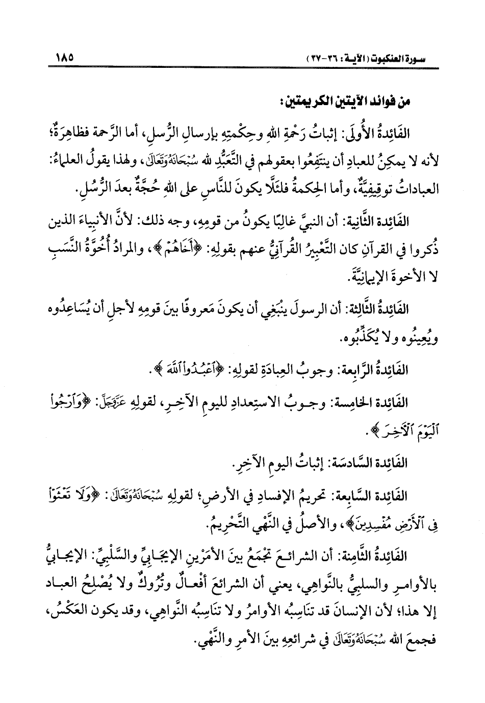 الفَائِدةُ الثَّامِنة: أن الشرائعَ تجْمَعُ بينَ الأمَرْينِ الإيجَابِيِّ والسَّلْبِيِّ: الإيجابيُّ بالأوامرِ والسلبِيُّ بالنَّواهِي، يعني أن الشرائعَ أفْعالٌ وتُرُوكٌ ولا يُصْلِحُ العباد إلا هذا؛ لأن الإنسانَ قد تنَاسِبُه الأوامرُ ولا تنَاسِبُه النَّواهِي، وقد يكون العَكْسُ، فجمعَ اللَّه سُبْحَانَهُ وَتَعَالَى في شرائعِهِ بينَ الأمرِ والنَّهْي.