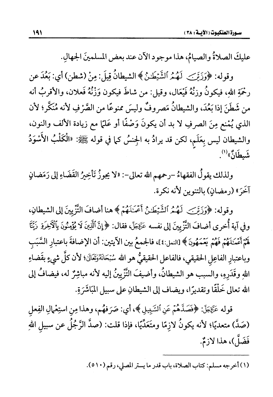 وقوله: {وَزَيَّنَ لَهُمُ الشَّيْطَانُ} الشَّيْطَانُ قِيلَ: مِنْ (شطن) أي: بَعُدَ عن رحْمَةِ اللَّهِ، فيكونُ وزنُهُ فَيْعَال، وقيل: من شاطَ فيكون وَزْنُهُ فَعلان، والأقربُ أنه من شَطَنَ إذا بَعُدَ، والشيطانُ مَصروفٌ وليسَ ممنوعًا من الصَّرْفِ لأنه مُنَكَّر؛ لأن الذي يُمْنع مِنَ الصرفِ لا بد أن يكونَ وَصْفًا أو عَلمًا مع زيادة الألف والنون، والشيطان ليس بِعَلَمٍ، لكن قد يرادُ به الجِنسُ كما في قوله -صلى اللَّه عليه وسلم-: "الْكَلْبُ الأَسْوَدُ شَّيْطَانٌ" (¬١).