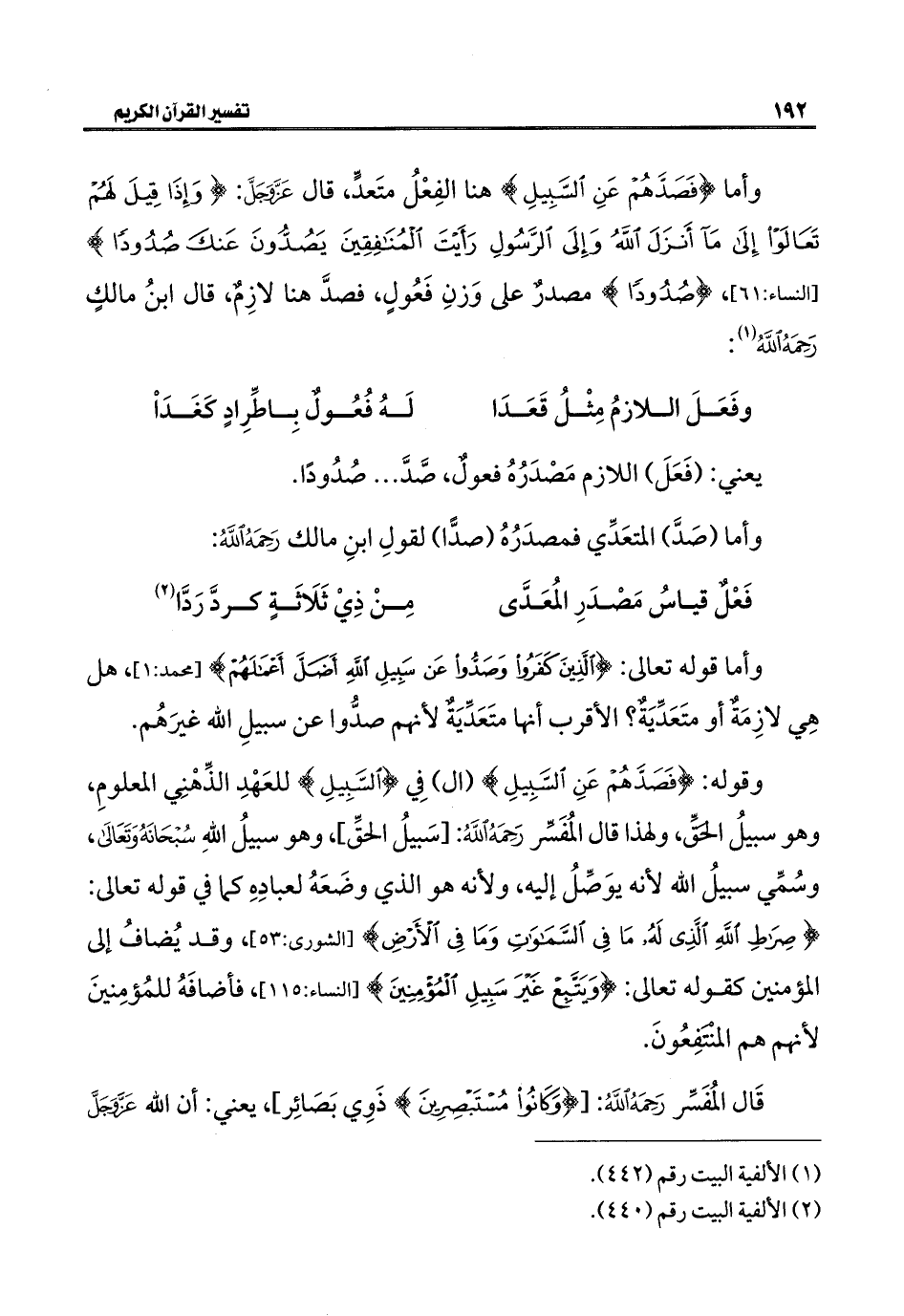 وأما {فَصَدَّهُمْ عَنِ السَّبِيلِ} هنا الفِعْلُ متَعدٍّ، قال عَزَّ وَجَلَّ: {وَإِذَا قِيلَ لَهُمْ تَعَالَوْا إِلَى مَا أَنْزَلَ اللَّهُ وَإِلَى الرَّسُولِ رَأَيْتَ الْمُنَافِقِينَ يَصُدُّونَ عَنْكَ صُدُودًا} [النساء: ٦١]، {صُدُودًا} مصدرٌ على وَزنِ فَعُولٍ، فصدَّ هنا لازِمٌ، قال ابنُ مالكٍ رَحِمَهُ اللَّهُ (¬١):