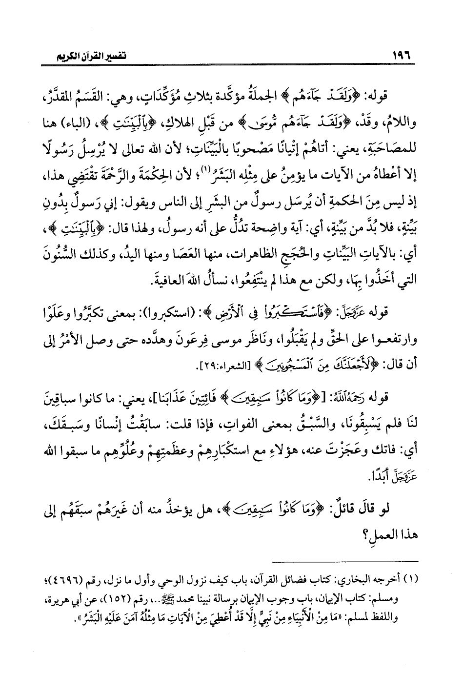 قوله: {وَلَقَدْ جَاءَهُمْ} الجملَةُ مؤكَّدة بثلاثِ مُؤَكِّدَاتٍ، وهي: القَسَمُ المقدَّرُ، واللامُ، وقَدْ، {وَلَقَدْ جَاءَهُمْ مُوسَى} من قَبْلِ الهلاكِ، {بِالْبَيِّنَاتِ}، (الباء) هنا للمصَاحَبَةِ، يعني: أتاهُمْ إتْيانا مَصْحوبًا بالْبَيِّنَاتِ؛ لأن اللَّه تعالى لا يُرْسِلُ رَسُولًا إلا أعْطاهُ من الآياتِ ما يؤمِنُ على مِثْلِه البَشَرُ (¬١)؛ لأن الحِكْمَةَ والرَّحْمَةَ تقْتَضِي هذا، إذ ليس مِنَ الحكمةِ أن يُرسَل رسولٌ من البشَرِ إلى الناس ويقول: إني رَسولٌ بِدُونِ بَيِّنةٍ، فلا بُدَّ من بَيِّنةٍ، أي: آية واضِحة تدُلُّ على أنه رسولُ، ولهذا قال: {بِالْبَيِّنَاتِ}، أي: بالآياتِ البَيِّناتِ والحُجَجِ الظاهرات، منها العَصَا ومنها اليدُ، وكذلك السُّنُونَ التي أخَذُوا بِهَا، ولكن مع هذا لم يَنْتَفِعُوا، نسألُ اللَّهَ العافيةَ.