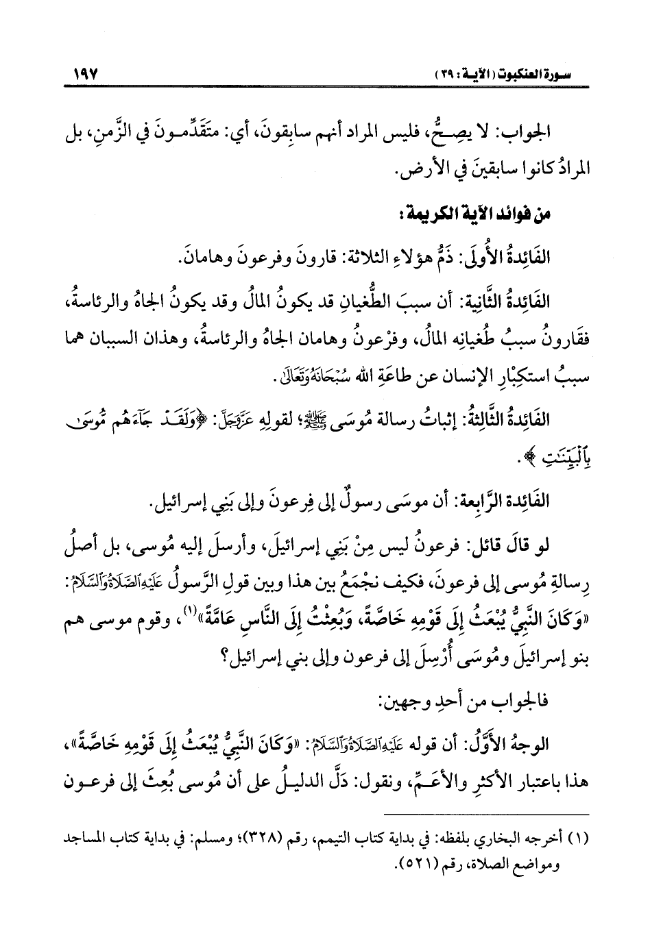 الفَائِدةُ الثَّانِية: أن سببَ الطُّغيانِ قد يكونُ المالُ وقد يكونُ الجاهُ والرئاسةُ، فقَارونُ سببُ طُغيانِه المالُ، وفرْعونُ وهامان الجاهُ والرئاسةُ، وهذان السببان هما سببُ استكِبْارِ الإنسان عن طاعَةِ اللَّه سُبْحَانَهُ وَتَعَالَى.