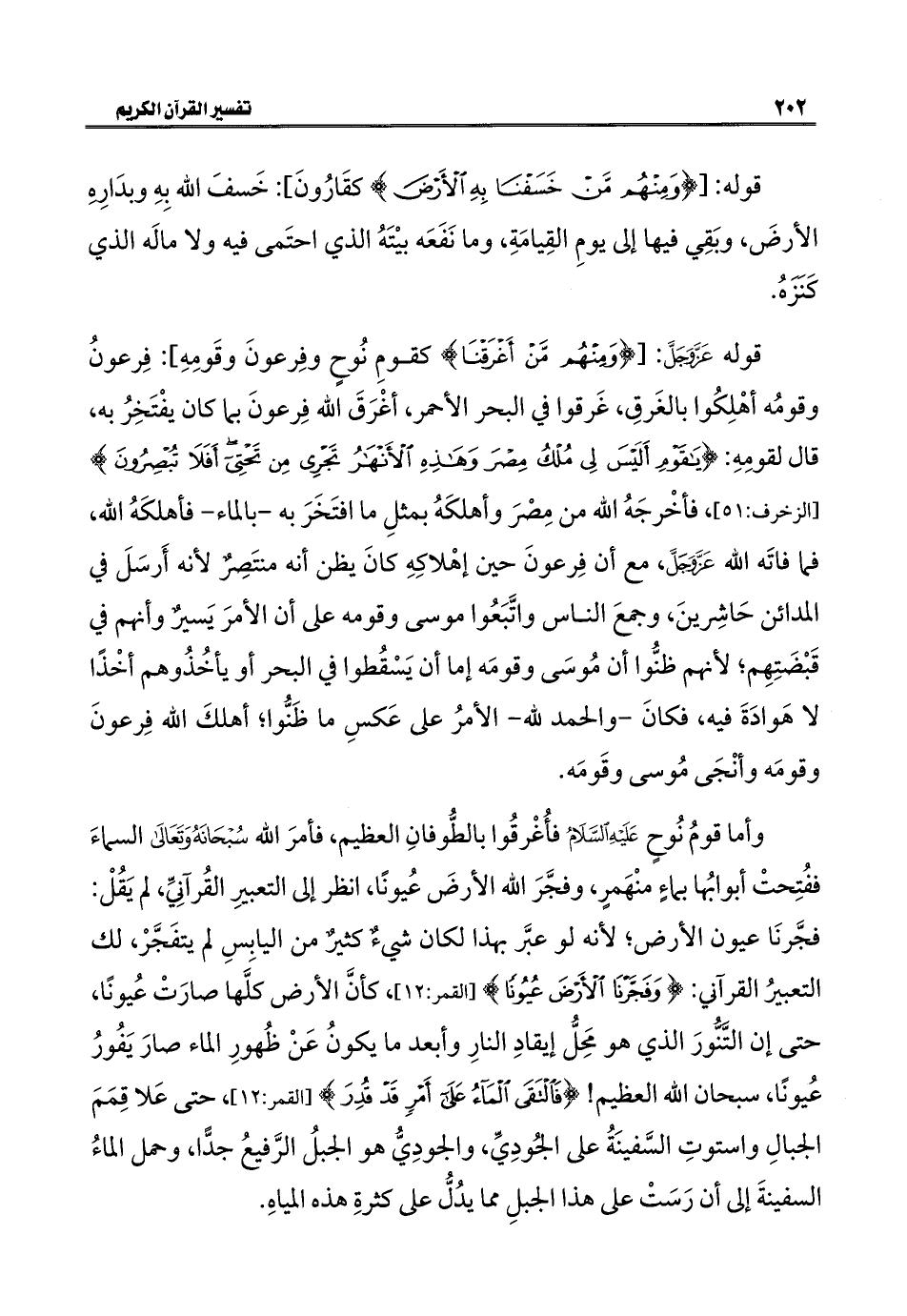 وأما قومُ نُوحٍ عَلَيْهِ السَّلَامُ فأُغْرقُوا بالطُّوفانِ العظيم، فأمرَ اللَّه سُبْحَانَهُ وَتَعَالَى السماءَ ففُتِحتْ أبوابُها بماءٍ منْهَمرٍ، وفجَّرَ اللَّه الأرضَ عُيونًا، انظر إلى التعبيرِ القُرآنِيِّ، لم يَقُلْ: فجَّرنَا عيون الأرض؛ لأنه لو عبَّر بهذا لكان شيءٌ كثيرٌ من اليابِسِ لم يتفَخَّرْ، لك التعبيرُ القرآني: {وَفَجَّرْنَا الْأَرْضَ عُيُونًا} [القمر: ١٢]، كأنَّ الأرض كلَّها صارَتْ عُيونًا، حتى إن التَّنُّورَ الذي هو مَحِلُّ إيقادِ النارِ وأبعد ما يكونُ عَنْ ظُهورِ الماء صارَ يَفُورُ عُيونًا، سبحان اللَّه العظيم! {فَالْتَقَى الْمَاءُ عَلَى أَمْرٍ قَدْ قُدِرَ} [القمر: ١٢]، حتى عَلا قِمَمَ الجبالِ واستوتِ السَّفينَةُ على الجُودِيِّ، والجودِيُّ هو الجبلُ الرَّفيعُ جدًّا، وحمل الماءُ السفينةَ إلى أن رَسَتْ على هذا الجبلِ مما يدُلُّ على كثرةِ هذه المياهِ.