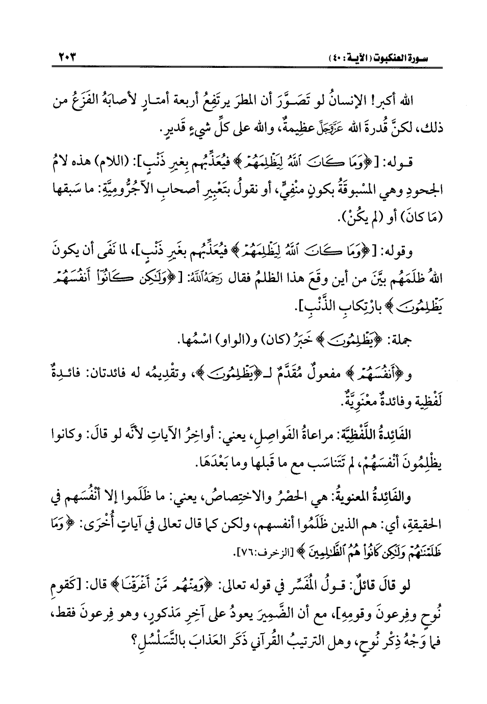 وقوله: {وَمَا كَانَ اللَّهُ لِيَظْلِمَهُمْ} فيُعَذِّبُهم بغَيرِ ذَنْبٍ]، لما نَفَى أن يكونَ اللَّهُ ظلَمَهُم بيَّنَ من أين وقَعَ هذا الظلمُ فقال رَحِمَهُ اللَّهُ: {وَلَكِنْ كَانُوا أَنْفُسَهُمْ يَظْلِمُونَ} بارْتِكابِ الذَّنْبِ].