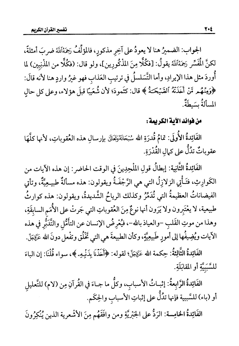 الجواب: الضميرُ هنا لا يعودُ على آخِرِ مذكورٍ, فالمؤلِّفُ رَحِمَهُ اللَّهُ ضربَ أمثلةً، لكنَّ المُفَسِّر رَحِمَهُ اللَّهُ يقولُ: [فكُلًّا مِنَ المذْكُورِين]، ولو قال: (فكُلًّا من المذْنِبِين) لما أُوردَ مثل هذا الإيرادِ، وأما التَّسَلسلُ في ترتيبِ العَذابِ فهو غيرُ واردٍ هنا لأنه قالَ: {وَمِنْهُمْ مَنْ أَخَذَتْهُ الصَّيْحَةُ} قال: كثَمودَ؛ لأن شُعَيبًا قبلَ هؤلاء، وعلى كل حالٍ المسألةُ بسَيطَةٌ.