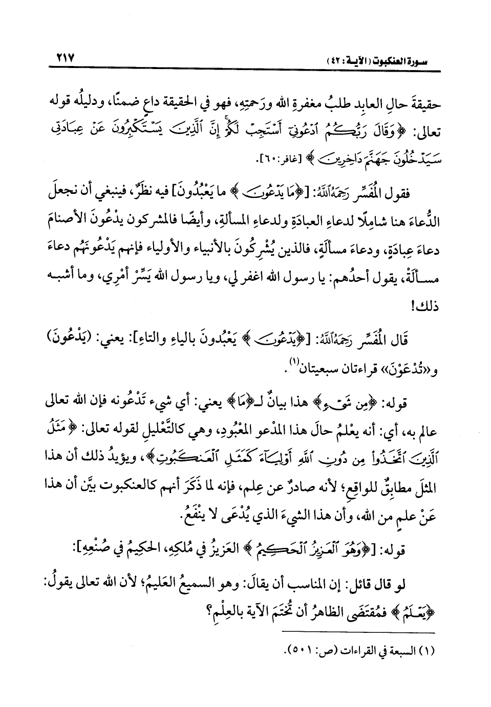 فقول المُفَسِّر رَحِمَهُ اللَّهُ: [{مَا يَدْعُونَ} ما يَعْبُدُونَ] فيه نظَرٌ، فينبغي أن نجعلَ الدُّعاءَ هنا شامِلًا لدعاءِ العبادَةِ ولدعاءِ المسألةِ، وأيضًا فالمشركون يدْعُونَ الأصنامَ دعاءَ عِبادَةٍ، ودعاءَ مسألَةٍ، فالذين يُشْرِكُونَ بالأنبياء والأولياء فإنهم يَدْعُونَهُم دعاءَ مسألَةْ، يقول أحدُهم: يا رسول اللَّه اغفر لي، ويا رسول اللَّه يَسِّرْ أمْرِي، وما أشبه ذلك!