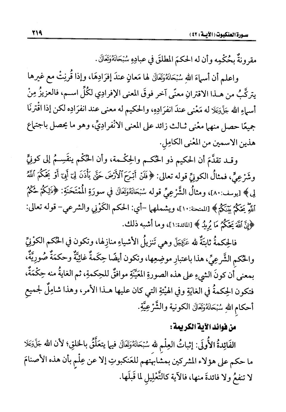 فالحِكمةُ ثابتَةٌ للَّه عَزَّ وَجَلَّ وهي تَنزيلُ الأشياءِ منازِلها، وتكون في الحُكم الكوْنِيِّ والحُكمِ الشَّرعِيِّ، هذا باعتبارِ موضِعِها، وتكون أيضًا حِكَمةٌ غائِيَّةٌ وحكمَةٌ صُورِيَّةٌ، بمعنى أن كونَ الشيءِ على هذه الصورةِ المعَيَّنَةِ موافقٌ للحِكمةِ، ثم الغايةُ منه حِكْمَةٌ، فتكون الحِكمةُ في الغايَةِ وفي الهيْئةِ التي كان عليها هذا الأمر، وهذا شامِلٌ لجميعِ أحكامِ اللَّهِ سُبْحَانَهُ وَتَعَالَى الكونية والشَّرْعِيَّةِ.
