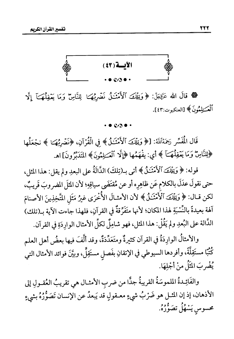 قَال المُفَسِّر رَحِمَهُ اللَّهُ: [{وَتِلْكَ الْأَمْثَالُ} فِي الْقُرْآنِ، {نَضْرِبُهَا} نجْعَلُها {لِلنَّاسِ وَمَا يَعْقِلُهَا} أي: يفْهَمُها {إِلَّا الْعَالِمُونَ} المتَدَبِّرُونَ] اهـ.