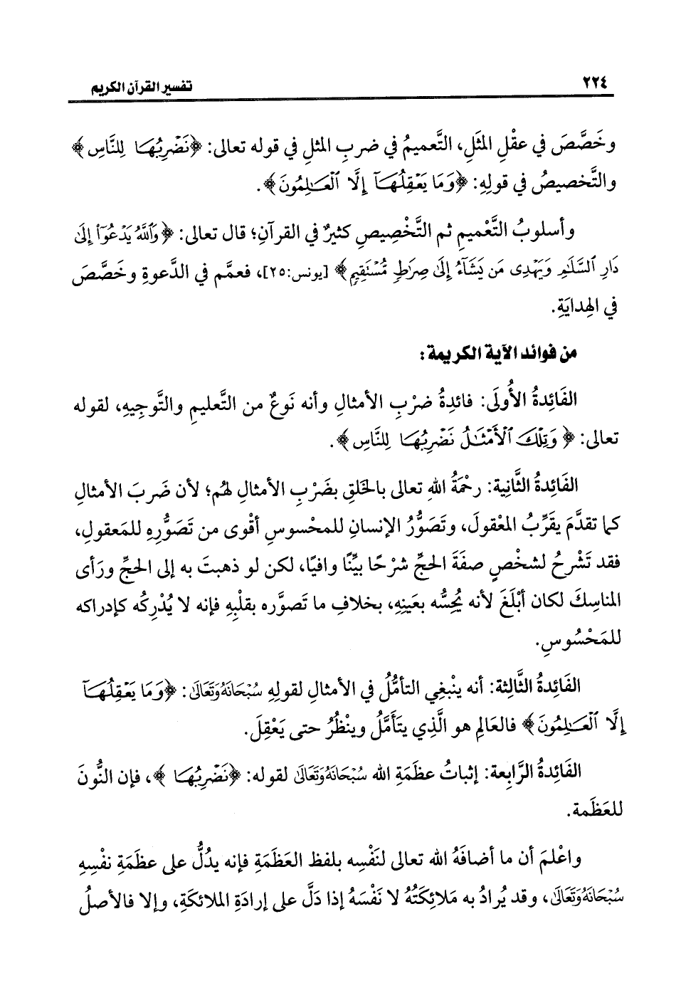 الفَائِدةُ الثَّالِثة: أنه ينْبغِي التأمُّلُ في الأمثالِ لقولِهِ سُبْحَانَهُ وَتَعَالَى: {وَمَا يَعْقِلُهَا إِلَّا الْعَالِمُونَ} فالعَالم هو الَّذِي يتَأَمَّلُ وينْظُرُ حتى يَعْقِلَ.