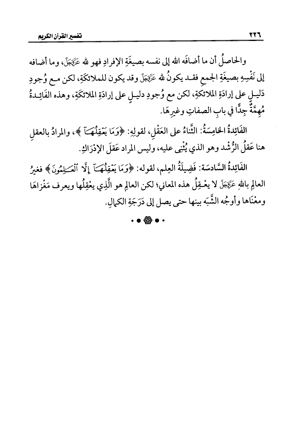 الفَائِدةُ الخامِسَةُ: الثَّناءُ على العَقْلِ، لقولِهِ: {وَمَا يَعْقِلُهَا}، والمرادُ بالعقلِ هنا عَقلُ الرُّشْد وهو الذي يُثْنِى عليه، وليس المراد عَقلَ الإدْرَاكِ.
