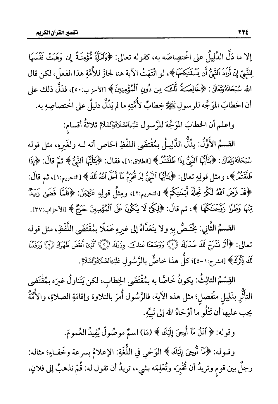 القسمُ الثَّانِي: يخْتَصُّ بِهِ ولا يتَعَدَّاهُ إلى غيرِهِ عَمَلًا بمُقْتَضَى اللَّفْظِ، مثل قوله تعالى: {أَلَمْ نَشْرَحْ لَكَ صَدْرَكَ (١) وَوَضَعْنَا عَنْكَ وِزْرَكَ (٢) الَّذِي أَنْقَضَ ظَهْرَكَ (٣) وَرَفَعْنَا لَكَ ذِكْرَكَ} [الشرح: ١ - ٤]؛ كلُّ هذا خاصٌّ بالرَّسُولِ عَلَيْهِ الصَّلَاةُ وَالسَّلَامُ.