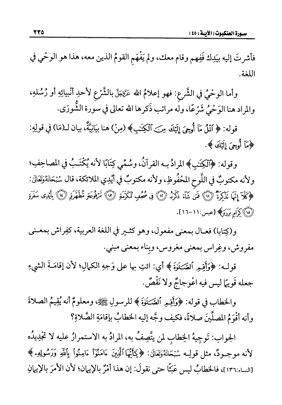 قوله: {اتْلُ مَا أُوحِيَ إِلَيْكَ مِنَ الْكِتَابِ} (مِنْ) هنا بيَانِيَّةٌ، بيان لـ (مَا) في قولِهِ: {مَا أُوحِيَ إِلَيْكَ}.