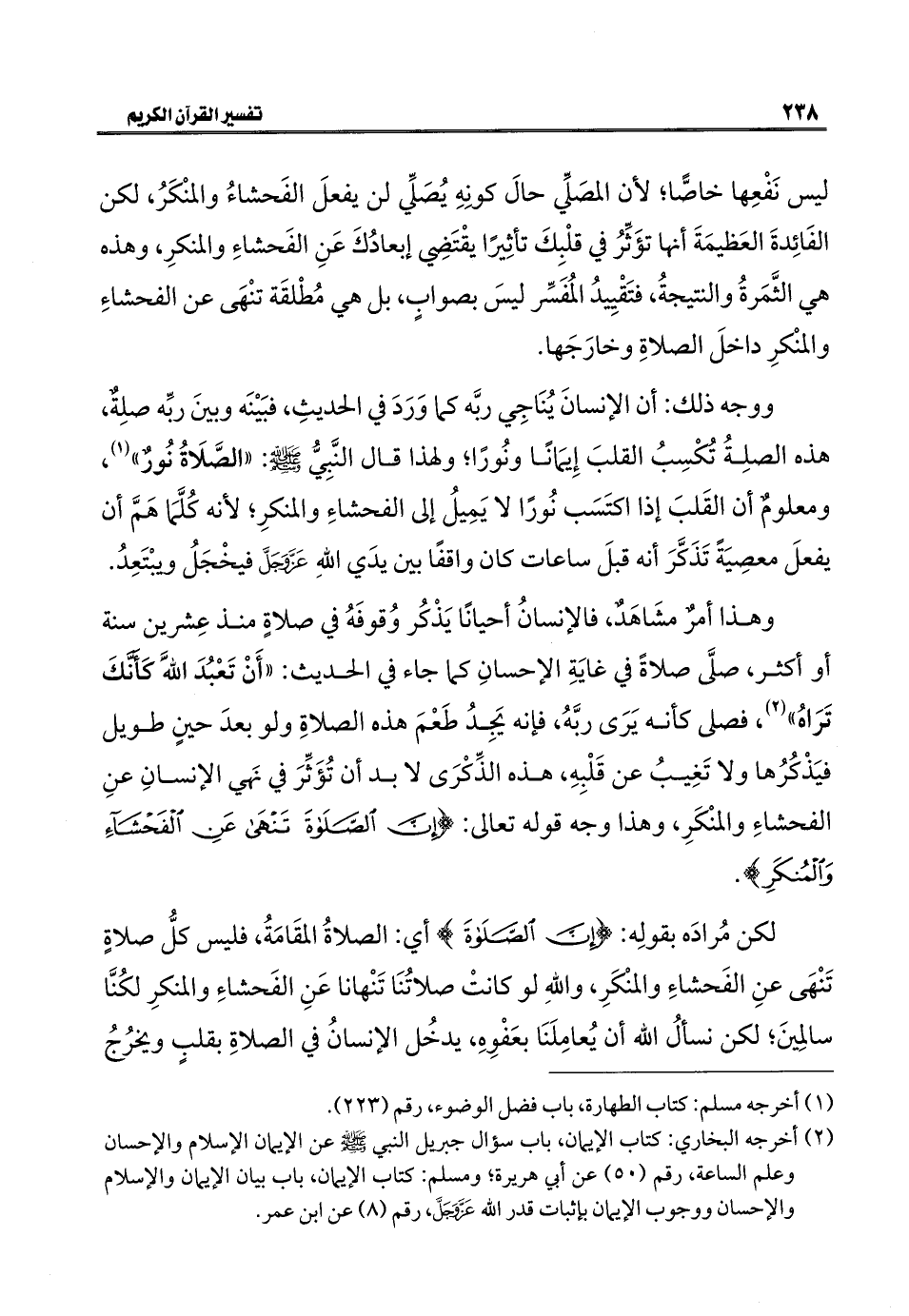 ووجه ذلك: أن الإنسانَ يُنَاجِي ربَّه كما وَرَدَ في الحديثِ، فبَيْنَه وبينَ ربِّه صلِةٌ، هذه الصلِةُ تُكْسِبُ القلبَ إِيمَانًا ونُورًا، ولهذا قال النَّبِيُّ -صلى اللَّه عليه وسلم-: "الصَّلَاةُ نُورٌ" (¬١)، ومعلومٌ أن القَلبَ إذا اكتَسَب نُورًا لا يَمِيلُ إلى الفحشاءِ والمنكرِ؛ لأنه كُلَّمَا هَمَّ أن يفعلَ معصِيَةً تَذَكَّرَ أنه قبلَ ساعات كان واقفًا بين يدَي اللَّهِ عَزَّ وَجَلَّ فيخْجَلُ ويبْتَعِدُ.