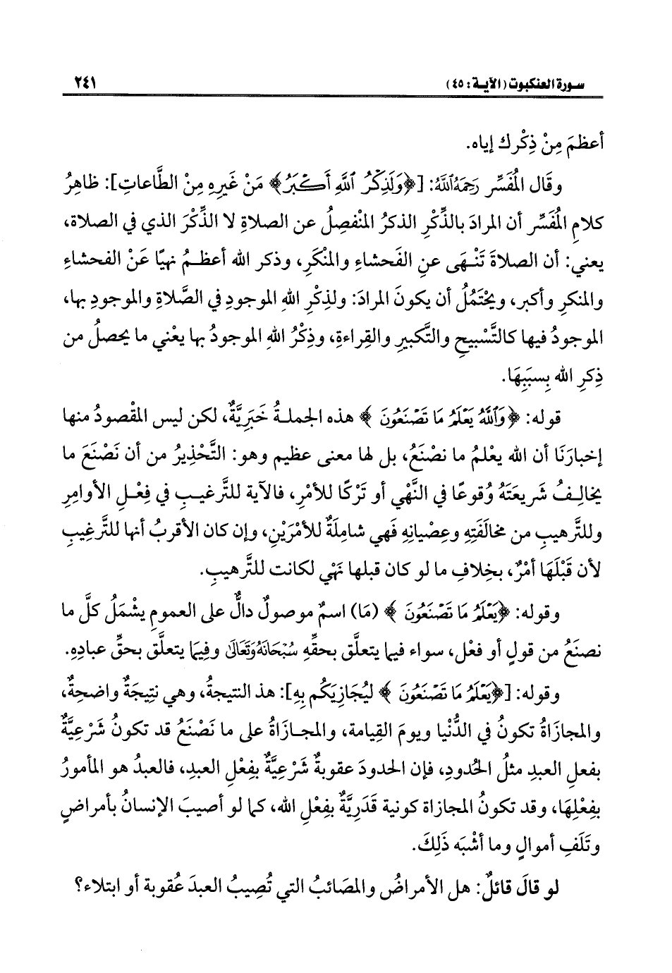 وقَال المُفَسِّر رَحِمَهُ اللَّهُ: [{وَلَذِكْرُ اللَّهِ أَكْبَرُ} مَنْ غَيرِهِ مِنْ الطَّاعاتِ]: ظاهِرُ كلامِ المُفَسِّر أن المرادَ بالذِّكْرِ الذكرُ المنْفصِلُ عن الصلاةِ لا الذِّكْرَ الذي في الصلاة، يعني: أن الصلاةَ تَنْهَى عنِ الفَحشاءِ والمنْكَرِ، وذكر اللَّه أعظمُ نهيًا عَنْ الفحشاءِ والمنكرِ وأكبر، ويحْتَمُلُ أن يكونَ المرادَ: ولذِكْرِ اللَّهِ الموجودِ في الصَّلاةِ والموجودِ بها، الموجودُ فيها كالتَّسْبيحِ والتَّكبيرِ والقِراءةِ، وذِكْرُ اللَّهِ الموجودُ بها يعْني ما يحصلُ من ذكرِ اللَّه بِسبَبِهَا.
