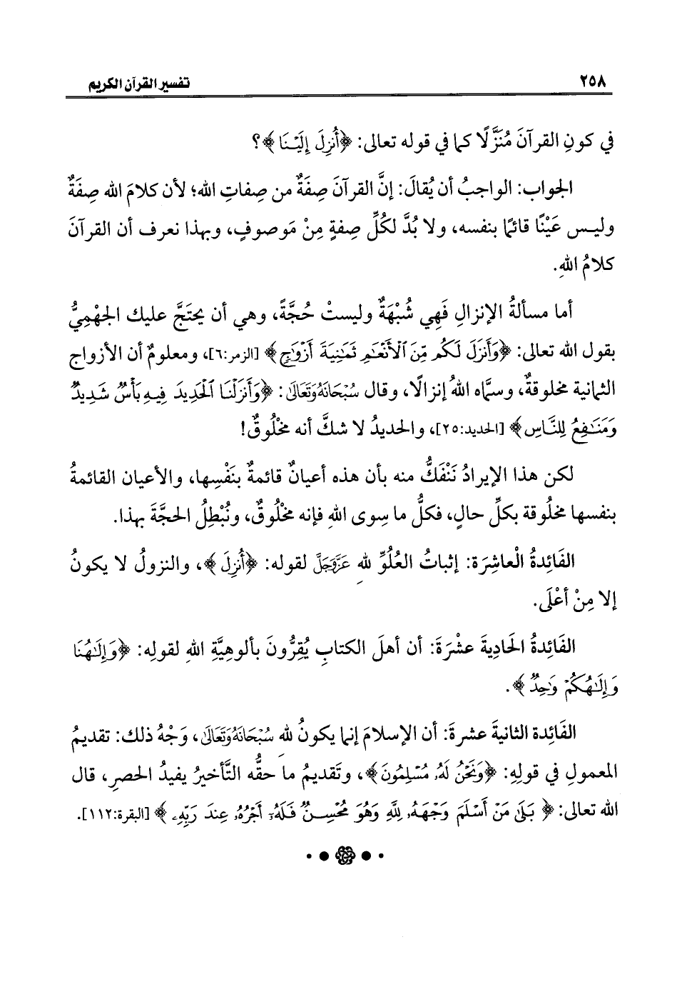 أما مسألةُ الإنزالِ فَهِي شُبْهَةٌ وليستْ حُجَّةً، وهي أن يحتَجَّ عليك الجهْمِيُّ بقول اللَّه تعالى: {وَأَنْزَلَ لَكُمْ مِنَ الْأَنْعَامِ ثَمَانِيَةَ أَزْوَاجٍ} [الزمر: ٦]، ومعلومٌ أن الأزواج الثمانية مخلوقةٌ، وسمَّاه اللَّهُ إنزالًا، وقال سُبْحَانَهُ وَتَعَالَى: {وَأَنْزَلْنَا الْحَدِيدَ فِيهِ بَأْسٌ شَدِيدٌ وَمَنَافِعُ لِلنَّاسِ} [الحديد: ٢٥]، والحديدُ لا شكَّ أنه مخْلُوقٌ!