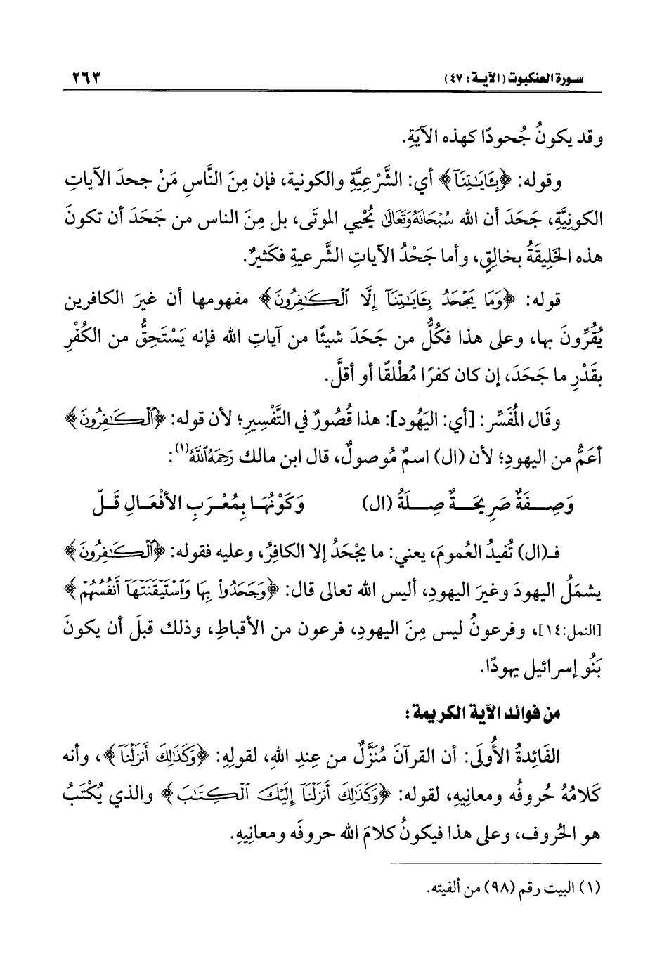 فـ (ال) تُفيدُ العُمومَ، يعني: ما يجْحَدُ إلا الكافِرُ، وعليه فقوله: {الْكَافِرُونَ} يشمَلُ اليهودَ وغيرَ اليهودِ، أليس اللَّه تعالى قال: {وَجَحَدُوا بِهَا وَاسْتَيْقَنَتْهَا أَنْفُسُهُمْ} [النمل: ١٤]، وفرعونُ ليس مِنَ اليهودِ، فرعون من الأقباطِ، وذلك قبلَ أن يكونَ بَنُو إسرائيل يهودًا.