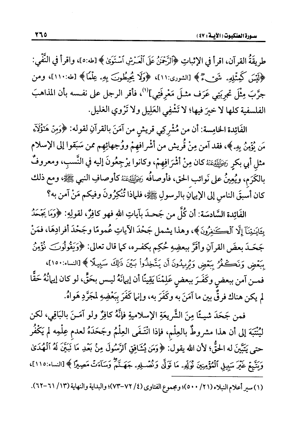 الفَائِدةُ الخامِسة: أن من مُشْرِكِي قريشٍ من آمَنَ بالقرآنِ لقوله: {وَمِنْ هَؤُلَاءِ مَنْ يُؤْمِنُ بِهِ}، فقد آمن مِنْ قُريش من أشْرافهِمْ ووُجهائِهِم ممن سَبقوا إلى الإسلام مثلِ أبي بكرٍ -رضي اللَّه عنه- كان مِنْ أشْرَافِهِمْ، وكانوا يرْجِعُونَ إليه في النَّسبِ، ومعروفٌ بالكَرَمِ، ويُعِينُ على نَوائب الحق، فأوصافُه -رضي اللَّه عنه- كأوصافِ النبي -صلى اللَّه عليه وسلم-، ومع ذلك كان أسبقَ الناسِ إلى الإيمانِ بالرسولِ -صلى اللَّه عليه وسلم-، فلماذا تُنْكِرُونَ وفيكم مَنْ آمن به؟