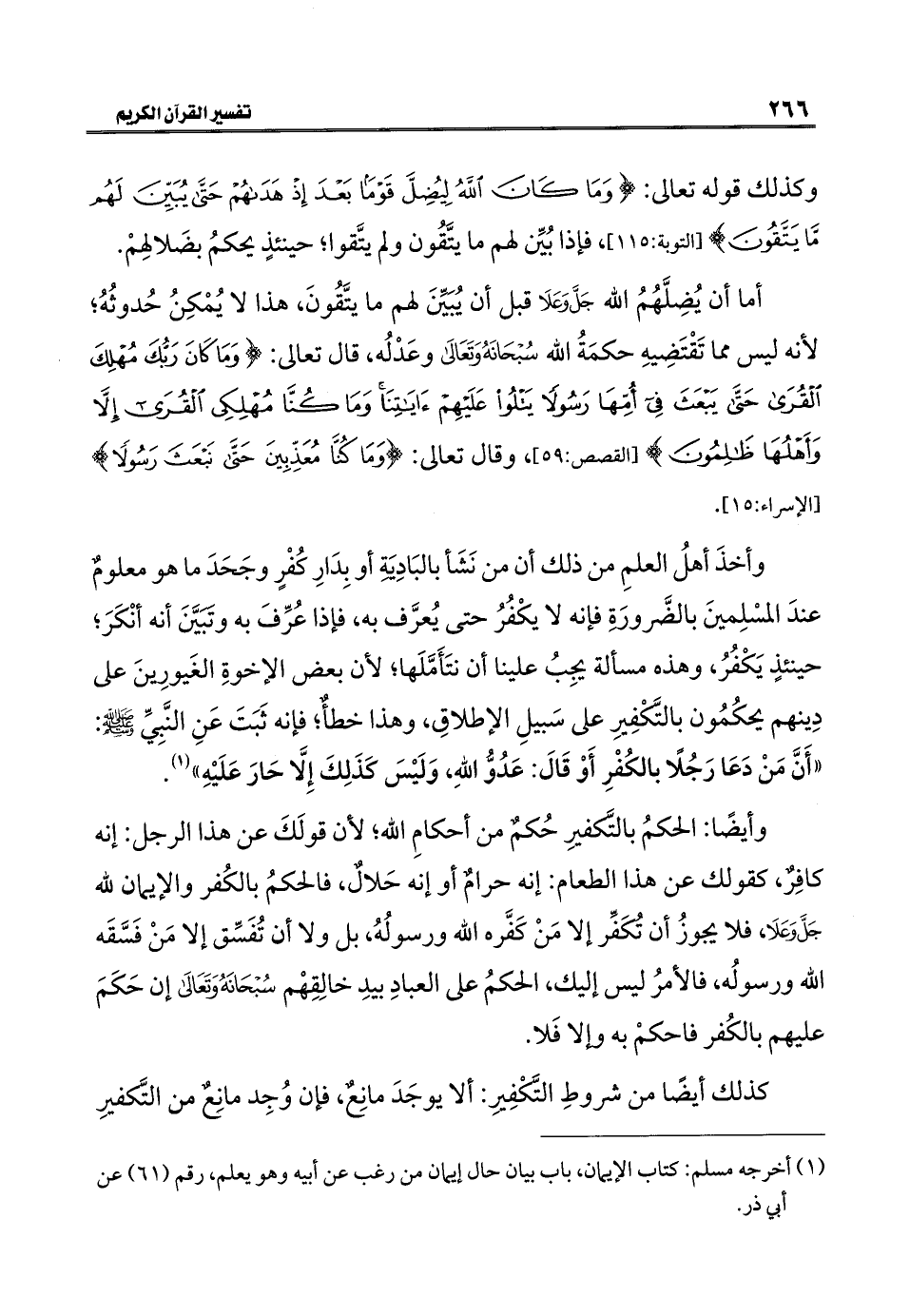 وكذلك قوله تعالى: {وَمَا كَانَ اللَّهُ لِيُضِلَّ قَوْمًا بَعْدَ إِذْ هَدَاهُمْ حَتَّى يُبَيِّنَ لَهُمْ مَا يَتَّقُونَ} [التوبة: ١١٥]، فإذا بُيِّن لهم ما يتَّقُون ولم يتَّقوا؛ حينئذٍ يحكمُ بضَلالهِمْ.