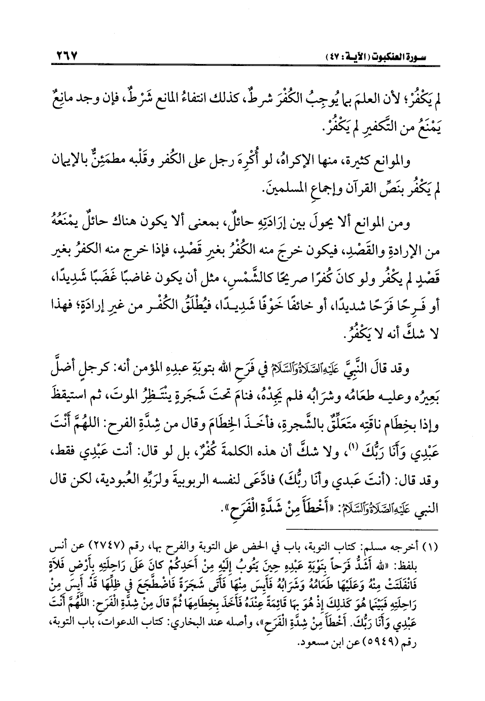 وقد قالَ النَّبِيَّ عَلَيْهِ الصَّلَاةُ وَالسَّلَامُ في فَرَحِ اللَّه بتوبَةِ عبدِهِ المؤمن أنه: كرجلٍ أضلَّ بَعِيرُه وعليه طعَامُه وشرَابُه فلم يَجِدْهُ، فنامَ تحتَ شَجَرةٍ ينْتَظِرُ الموتَ، ثم استيقظَ وإذا بخِطَام ناقَتِه متَعَلِّقٌ بالشَّجرةِ، فأخَذَ الخِطَامَ وقال من شِدَّةِ الفرح: اللهُمَّ أَنْتَ عَبْدِي وَأَنَا رَبُّكَ (¬١)، ولا شكَّ أن هذه الكلمةَ كُفْرٌ، بل لو قال: أنت عَبْدِي فقط، وقد قال: (أنتَ عَبدي وأَنَا ربُّكَ) فادَّعَى لنفسه الربوبيةَ ولرَبِّهِ العُبودية، لكن قال النبي عَلَيْهِ الصَّلَاةُ وَالسَّلَامُ: "أَخْطَأَ مِنْ شَدَّةِ الْفَرَحِ".