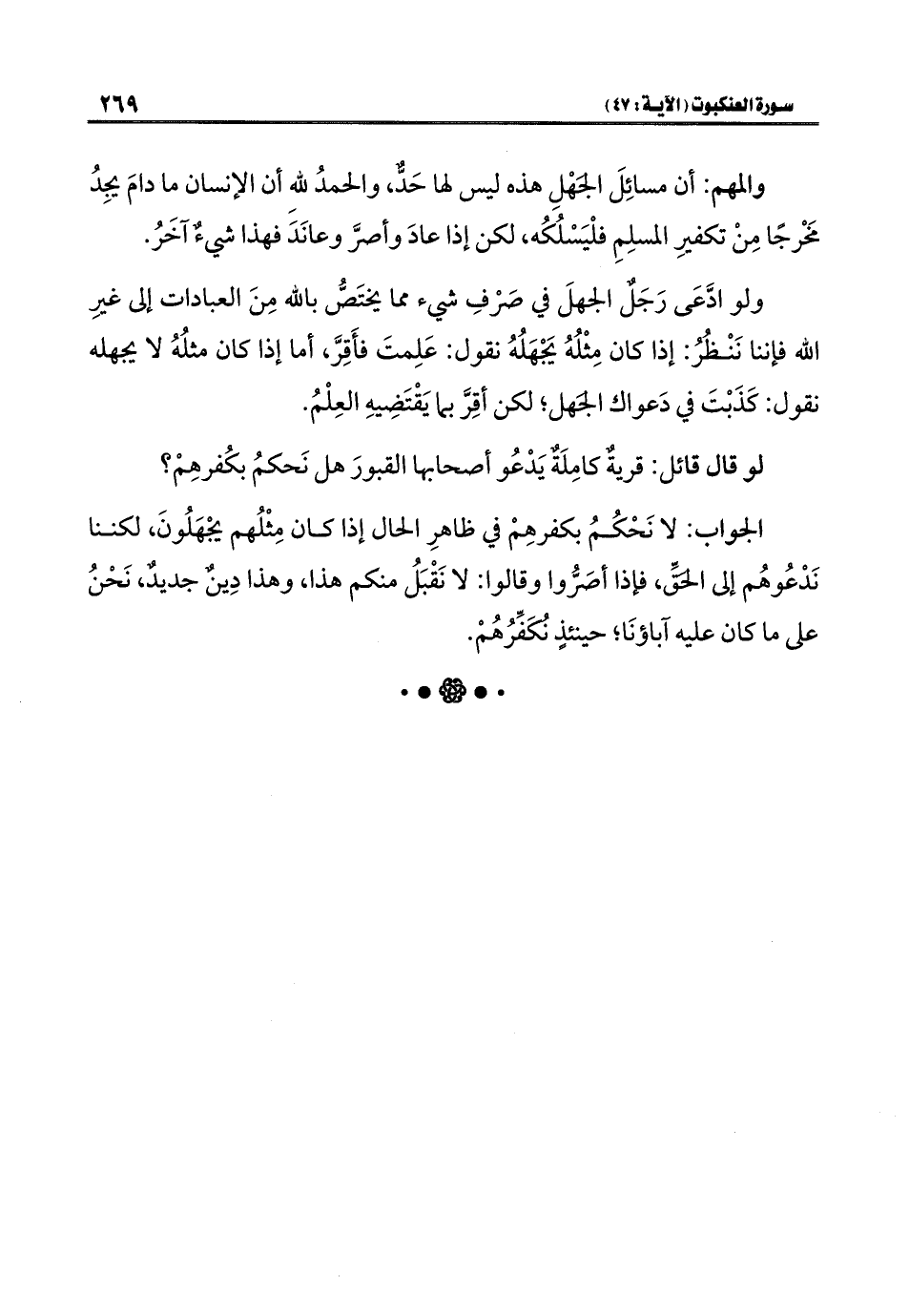 ولو ادَّعَى رَجَلٌ الجهلَ في صَرْفِ شيء مما يختَصُّ باللَّه مِنَ العبادات إلى غيرِ اللَّه فإننا نَنْظُرُ: إذا كان مِثْلُهُ يَجْهَلُهُ نقول: عَلِمتَ فأَقِرَّ، أما إذا كان مثلُهُ لا يجهله نقول: كَذَبْتَ في دَعواك الجهل؛ لكن أقِرَّ بما يَقْتَضِيهِ العِلْمُ.
