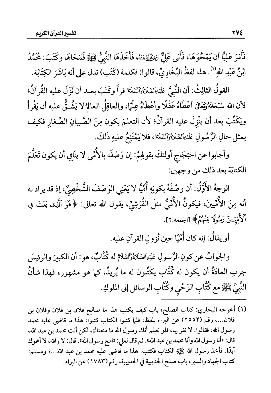 وأجابوا عن احتِجَاجِ أولئكَ بقولهِمْ: إن وَصْفَه بالأُمِّي لا ينَافِي أن يكون تَعَلَّمَ الكتابَة بعد ذلك من وجهين: