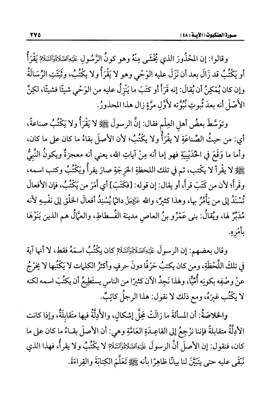 والخلاصَةُ: أن المسألةَ ما زالَتْ مَحِلَّ إشكالٍ، والأَدِلَّةُ فيها متَقابِلَةٌ، وإذا كانت الأدِلَّةُ متقابلةً فإننا نرْجِعُ إلى القاعِدَةِ العَامَّةِ وهي: أن الأصلَ بقاءُ ما كان على ما كان، فنقول: إن الأصلَ أنَّ الرسولَ عَلَيْهِ الصَّلَاةُ وَالسَّلَامُ لا يكْتُبُ ولا يقرأُ، فهذا الذي نَبْقَى عليه حتى يتبَيَّنَ لنا بيانًا ظاهِرًا بأنه -صلى اللَّه عليه وسلم- تَعَلَّمَ الكِتابَةَ والقِراءَةَ.
