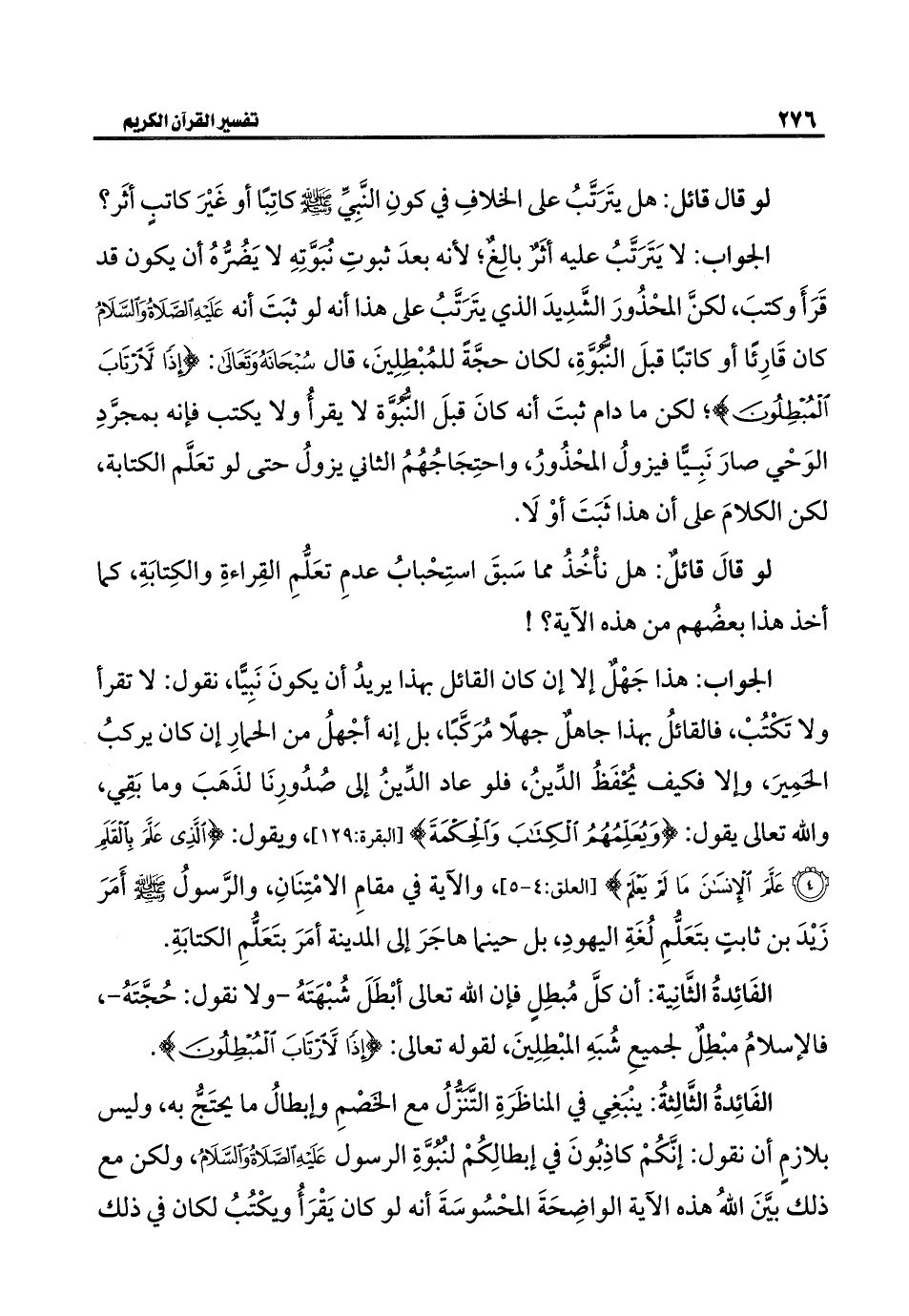 لو قال قائل: هل يتَرَتَّبُ على الخلافِ في كونِ النَّبِيِّ -صلى اللَّه عليه وسلم- كاتِبًا أو غَيْرَ كاتبٍ أثَر؟ الجواب: لا يَتَرَتَّبُ عليه أثَرٌ بالِغٌ؛ لأنه بعدَ ثبوتِ نبوَّتِهِ لا يَضُرُّهُ أن يكون قد قَرَأَ وكتبَ، لكنَّ المحْذُورَ الشَّدِيدَ الذي يتَرَتَّبُ على هذا أنه لو ثبَتَ أنه عَلَيْهِ الصَّلَاةُ وَالسَّلَامُ كان قَارِئًا أو كاتبًا قبلَ النُّبُوَّةِ، لكان حجَّةً للمُبْطِلِينَ، قال سُبْحَانَهُ وَتَعَالَى: {إِذًا لَارْتَابَ الْمُبْطِلُونَ}؛ لكن ما دام ثبتَ أنه كانَ قبلَ النُّبُوُّة لا يقرأ ولا يكتب فإنه بمجرَّدِ الوَحْي صارَ نَبِيًّا فيزولُ المحْذُورُ، واحتِجَاجُهُمُ الثاني يزولُ حتى لو تعَلَّم الكتابة، لكن الكلامَ على أن هذا ثَبَتَ أوْ لَا.