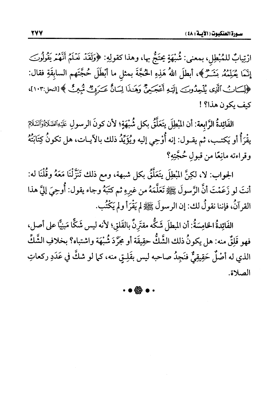 الفَائِدةُ الرَّابِعة: أن المبْطِلَ يتَعَلَّقُ بكل شُبْهَةٍ؛ لأن كونَ الرسولِ عَلَيْهِ الصَّلَاةُ وَالسَّلَامُ يقْرَأُ أو يَكتب، ثم يقول: إنه أُوْحِي إليه ويُؤيِّدُ ذلك بالآيات، هل تكونُ كِتَابَتُهُ وقراءته مانِعًا من قبولِ حُجَّتِهِ؟