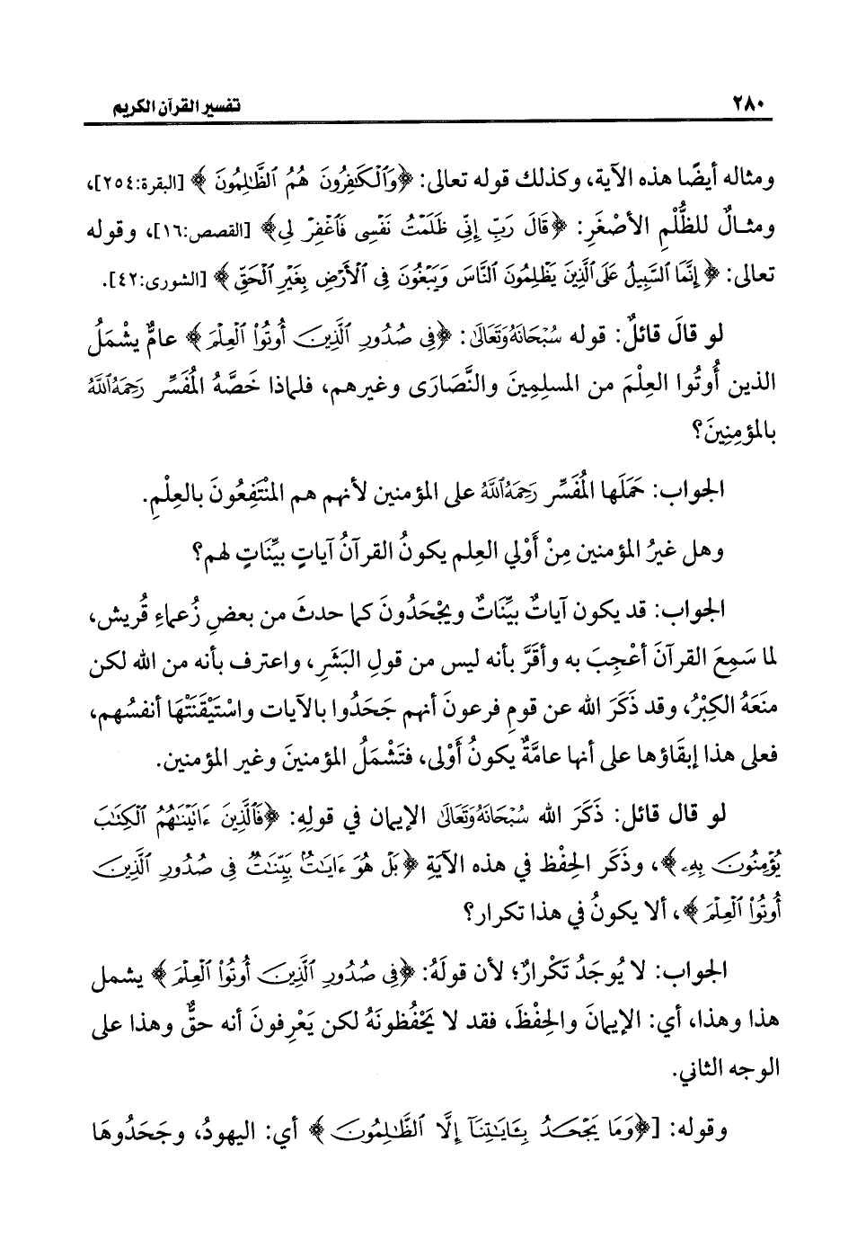 لو قالَ قائلٌ: قوله سُبْحَانَهُ وَتَعَالَى: {فِي صُدُورِ الَّذِينَ أُوتُوا الْعِلْمَ} عامٌّ يشْمَلُ الذين أُوتُوا العِلْمَ من المسلِمِينَ والنَّصَارَى وغيرهم، فلماذا خَصَّهُ المُفَسِّر رَحِمَهُ اللَّهُ بالمؤمِنِينَ؟
