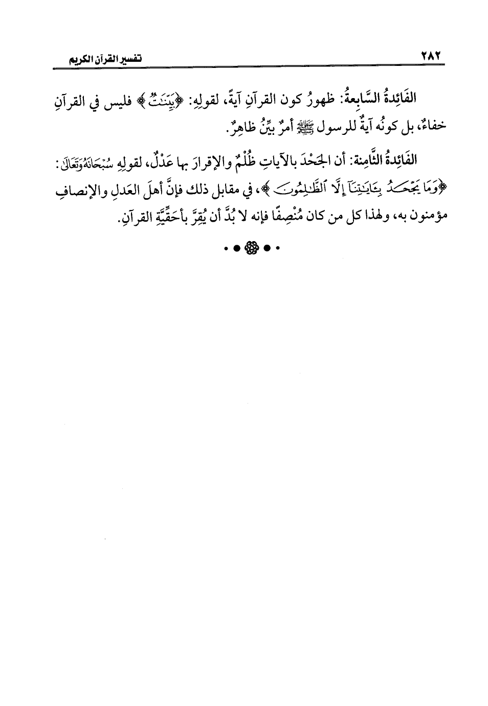 الفَائِدةُ الثَّامِنة: أن الجَحْدَ بالآياتِ ظُلْمٌ والإقرارَ بها عَدْلٌ، لقولِهِ سُبْحَانَهُ وَتَعَالَى: {وَمَا يَجْحَدُ بِآيَاتِنَا إِلَّا الظَّالِمُونَ}، في مقابل ذلك فإنَّ أهلَ العَدلِ والإنصافِ مؤمنون به، ولهذا كل من كان مُنْصِفًا فإنه لا بُدَّ أن يُقِرَّ بأحَقِّيَّةِ القرآنِ.