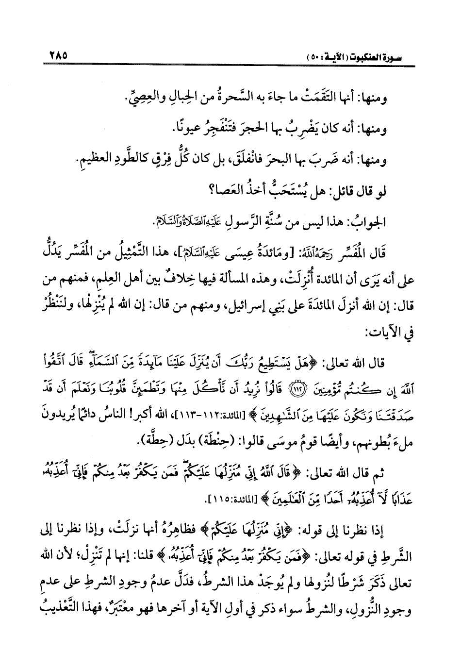 قَال المُفَسِّر رَحِمَهُ اللَّهُ: [ومَائدَةُ عِيسَى عَلَيْهِ السَّلَامُ]، هذا التَّمْثِيلُ من المُفَسِّر يَدُلُّ على أنه يَرَى أن المائدة أُنْزِلَتْ، وهذه المسألة فيها خِلافٌ بين أهل العِلمِ، فمنهم من قال: إن اللَّه أنزلَ المائدَةَ على بَنِي إسرائيل، ومنهم من قال: إن اللَّه لم يُنْزِلْها، ولنَنْظُرْ في الآيات: