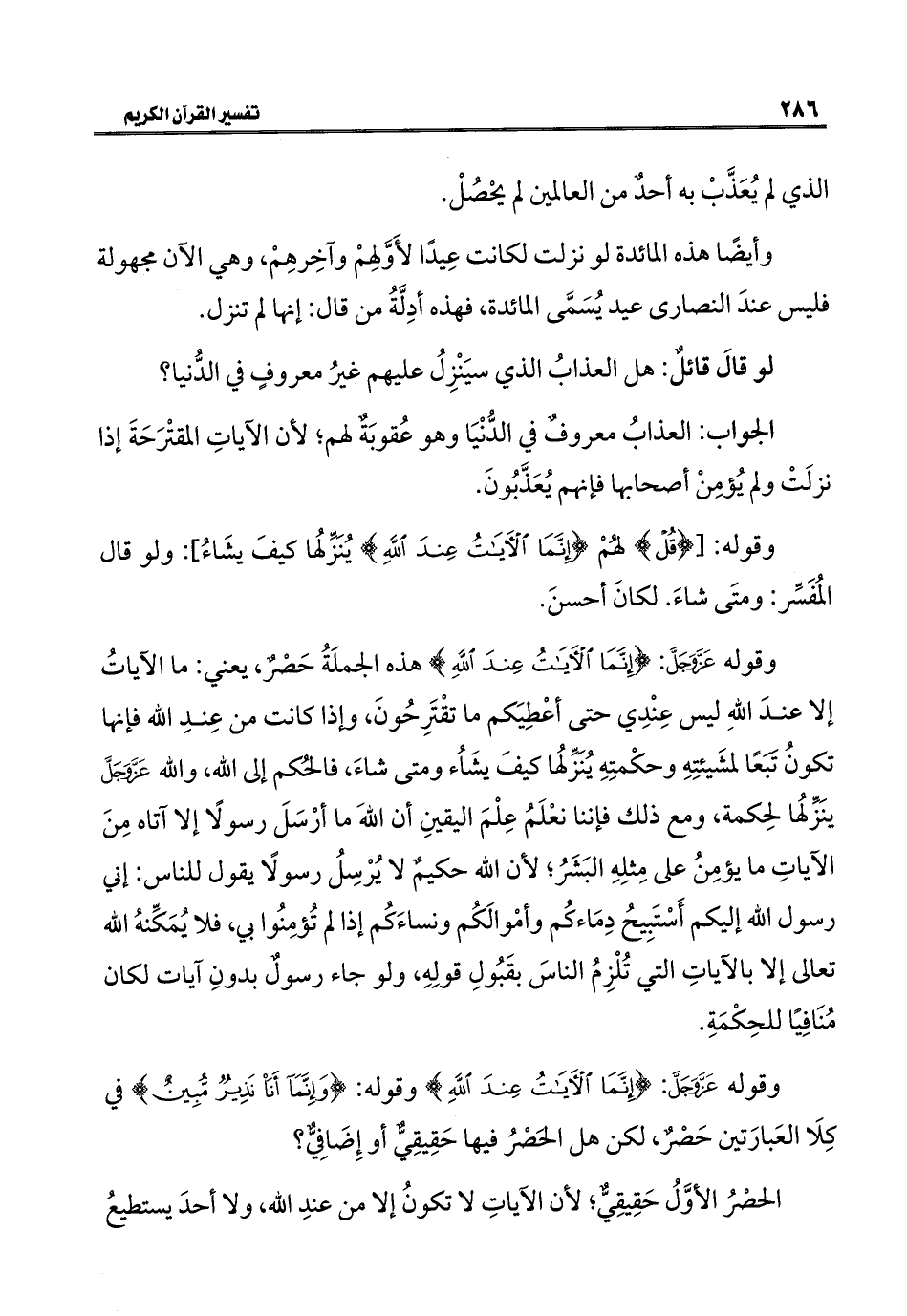 وقوله عَزَّ وَجَلَّ: {إِنَّمَا الْآيَاتُ عِنْدَ اللَّهِ} وقوله: {وَإِنَّمَا أَنَا نَذِيرٌ مُبِينٌ} في كِلَا العَبارَتين حَصْرٌ، لكن هل الحَصْرُ فيها حَقِيقِيٌّ أو إِضَافِيٌّ؟