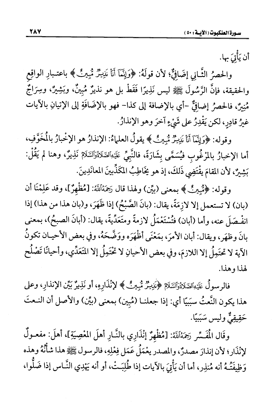 والحصرُ الثَّانِي إضَافِيٌّ؛ لأن قولَهُ: {وَإِنَّمَا أَنَا نَذِيرٌ مُبِينٌ} باعتبارِ الواقِعِ والحقيقة، فإنَّ الرَّسُولَ -صلى اللَّه عليه وسلم- ليس نَذِيرًا فَقَطْ بل هو نذيرٌ مُبِينٌ، وبَشِيرٌ، وسِرَاجٌ مُنير، فالحصرُ إضافِيٌّ -أي بالإضافة إلى كذا- فهو بالإضَافَةِ إلى الإتيانِ بالآيات غيرُ قادِرٍ، لكن يَقْدِرُ على شَيْءٍ آخرَ وهو الإنذارُ.