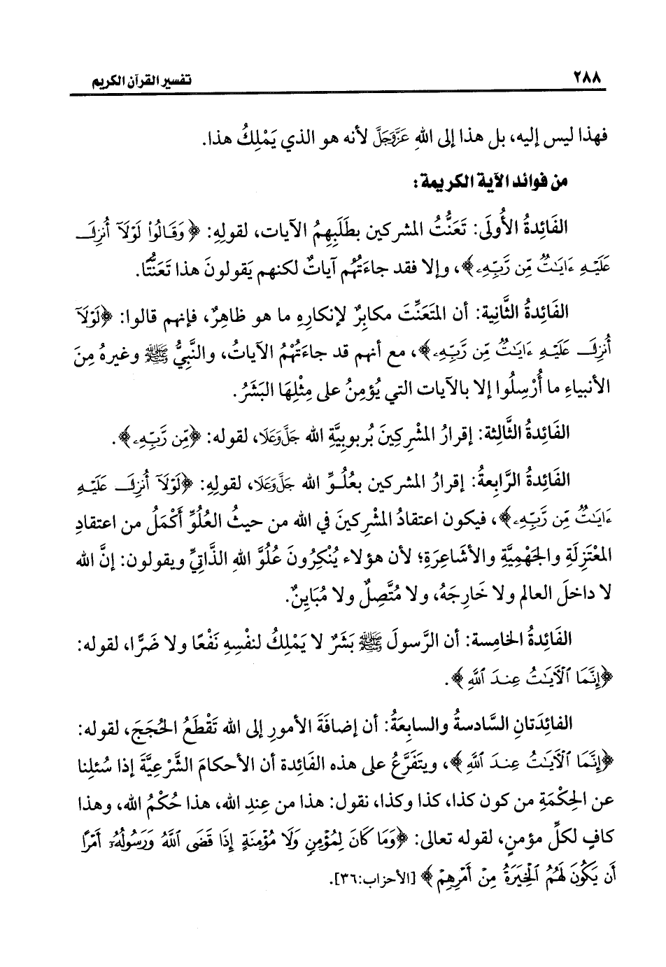 الفائِدَتانِ السَّادسةُ والسابِعَةُ: أن إضافَةَ الأمورِ إلى اللَّه تَقْطَعُ الحُجَجَ، لقوله: {إِنَّمَا الْآيَاتُ عِنْدَ اللَّهِ}، ويتَفَرَّعُ على هذه الفَائِدة أن الأحكامَ الشَّرْعِيَّةَ إذا سُئلِنا عن الحِكْمَةِ من كون كذا، كذا وكذا، نقول: هذا من عِندِ اللَّه، هذا حُكْمُ اللَّه، وهذا كافٍ لكلِّ مؤمنٍ، لقوله تعالى: {وَمَا كَانَ لِمُؤْمِنٍ وَلَا مُؤْمِنَةٍ إِذَا قَضَى اللَّهُ وَرَسُولُهُ أَمْرًا أَنْ يَكُونَ لَهُمُ الْخِيَرَةُ مِنْ أَمْرِهِمْ} [الأحزاب: ٣٦].