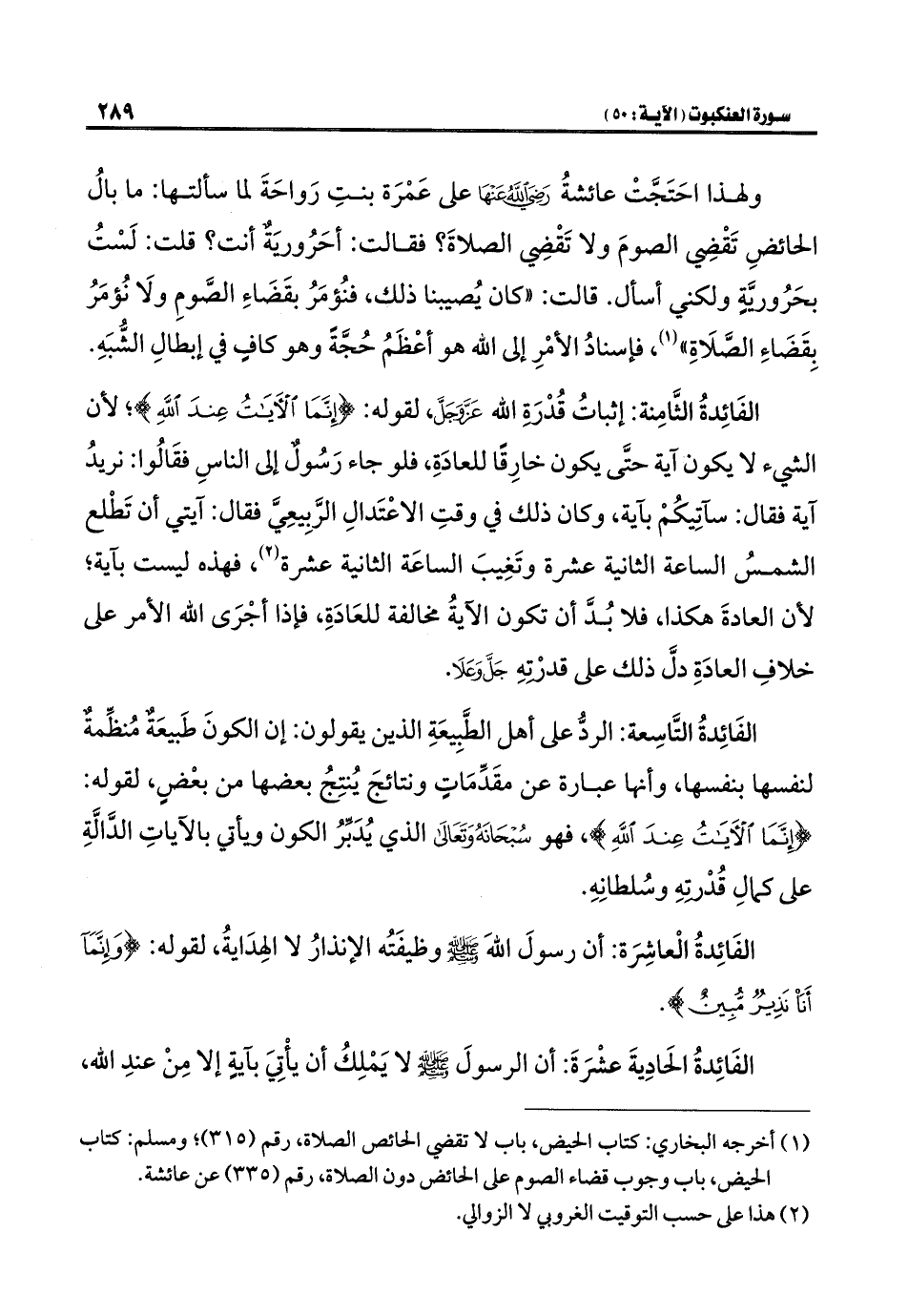 ولهذا احَتَجَّتْ عائشةُ -رضي اللَّه عنها- على عَمْرَة بنتِ رَواحَةَ لما سألتها: ما بالُ الحائضِ تَقْضِي الصومَ ولا تَقْضي الصلاةَ؟ فقالت: أحَرُورَيةٌ أنت؟ قلت: لَسْتُ بحَرُورَّيةٍ ولكني أسأل. قالت: "كان يُصيبنا ذلك، فنُؤمَرُ بقَضَاءِ الصَّومِ ولَا نُؤمَرُ بِقَضَاءِ الصَّلَاةِ" (¬١)، فإسنادُ الأمْرِ إلى اللَّه هو أعْظَمُ حُجَّةً وهو كافٍ في إبطالِ الشُّبَهِ.