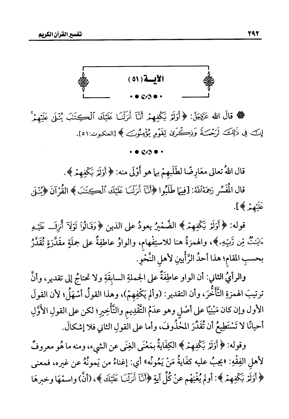 قوله: {أَوَلَمْ يَكْفِهِمْ} الضَّمْيرُ يعودُ على الذين {وَقَالُوا لَوْلَا أُنْزِلَ عَلَيْهِ آيَاتٌ مِنْ رَبِّهِ}، والهمزةُ هنا للاستِفْهامِ، والواوُ عاطفِةٌ على جملَةٍ مقَدَّرَةٍ تُقَدَّرُ بحسبِ المقامِ؛ هذا أحدُ الرَّأْيينِ لأهلِ النَّحْوِ.