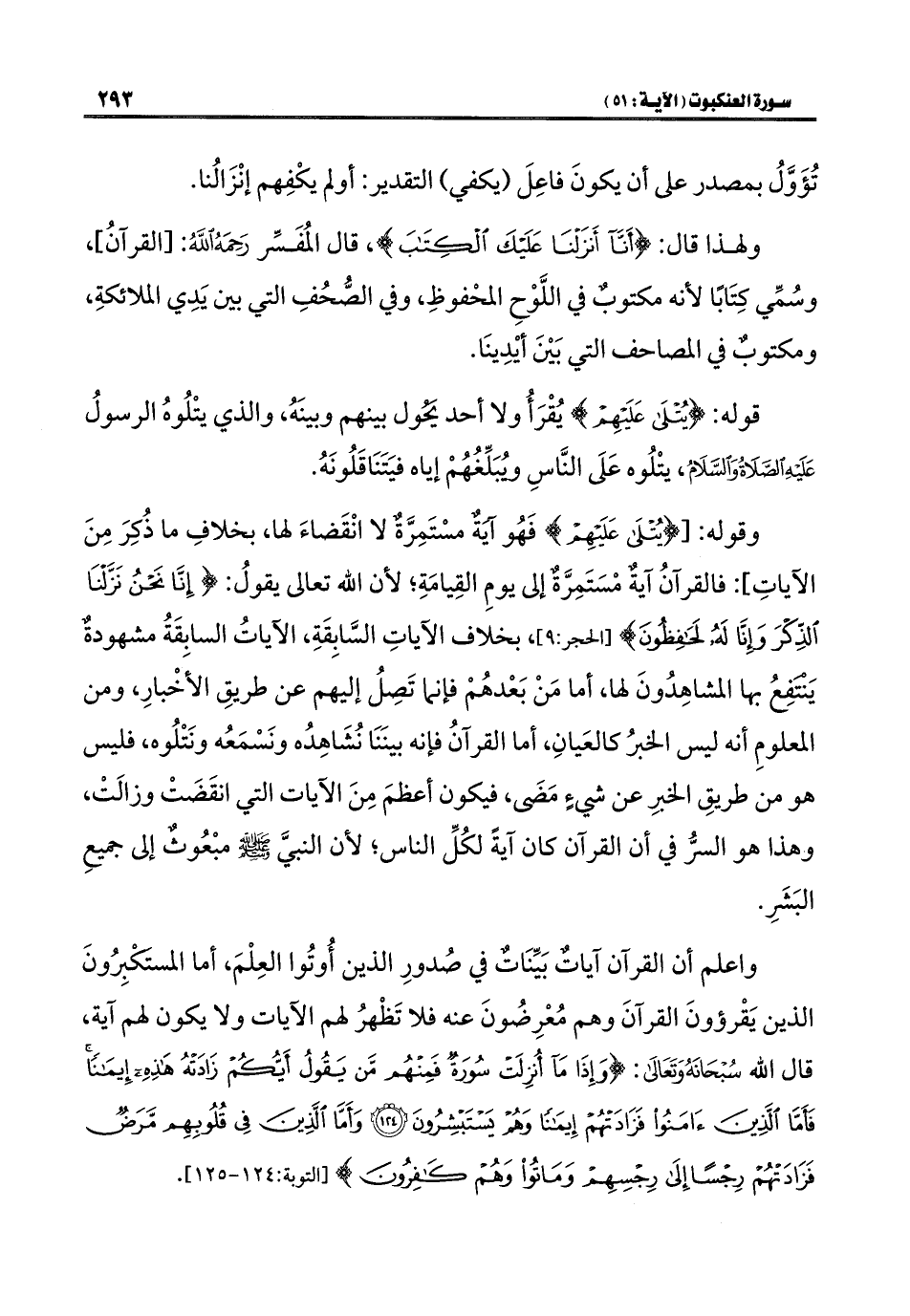 وقوله: [{يُتْلَى عَلَيْهِمْ} فَهُو آيَةٌ مسْتَمِرَّةٌ لا انْقَضاءَ لها، بخلافِ ما ذُكِرَ مِنَ الآياتِ]: فالقرآنُ آيةٌ مْسَتَمِرَّةٌ إلى يومِ القِيامَةِ؛ لأن اللَّه تعالى يقولُ: {إِنَّا نَحْنُ نَزَّلْنَا الذِّكْرَ وَإِنَّا لَهُ لَحَافِظُونَ} [الحجر: ٩]، بخلاف الآياتِ السَّابِقَةِ، الآياتُ السابِقَةُ مشهودةٌ يَنْتَفِعُ بها المشاهِدُونَ لها، أما مَنْ بَعْدهُمْ فإنما تَصِلُ إليهم عن طريقِ الأخْبارِ، ومن المعلومِ أنه ليس الخبرُ كالعَيانِ، أما القرآنُ فإنه بينَنَا نُشَاهِدُه ونَسْمَعُه ونَتْلُوه، فليس هو من طريقِ الخبرِ عن شيءٍ مَضَى، فيكون أعظمَ مِنَ الآيات التي انقَضَتْ وزالَتْ، وهذا هو السرُّ في أن القرآن كان آيةً لكُلِّ الناس؛ لأن النبيَّ -صلى اللَّه عليه وسلم- مبْعُوثٌ إلى جميعِ البَشَرِ.