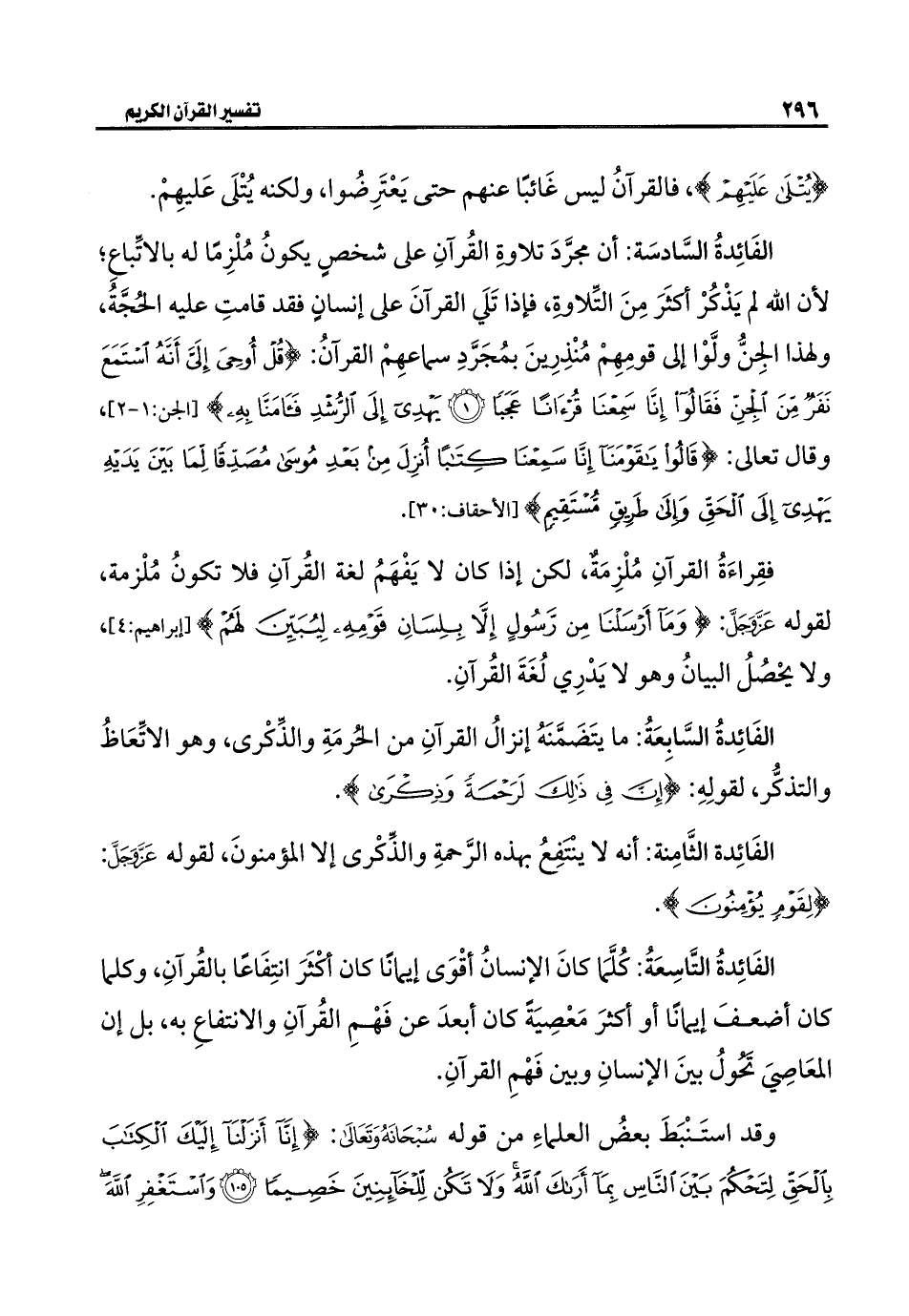 الفَائِدةُ التَّاسِعَةُ: كُلَّمَا كانَ الإنسانُ أقْوَى إيمانًا كان أكْثَرَ انتِفَاعًا بالقُرآنِ، وكلما كان أضعفَ إيمانًا أو أكثرَ مَعْصِيَةً كان أبعدَ عن فَهْمِ القُرآنِ والانتفاعِ به، بل إن المعَاصِيَ تحولُ بينَ الإنسانِ وبين فَهْمِ القرآنِ.