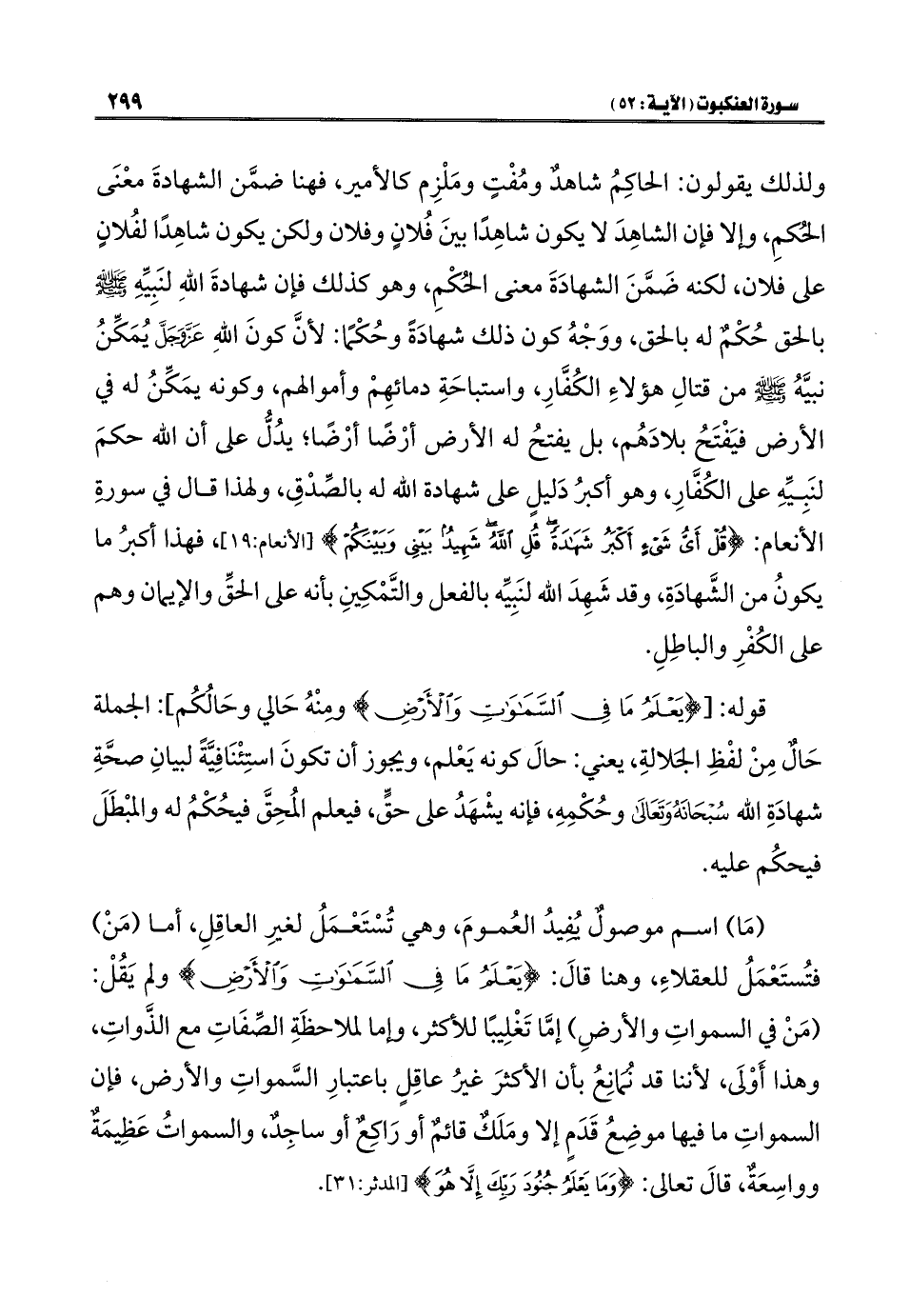قوله: [{يَعْلَمُ مَا فِي السَّمَاوَاتِ وَالْأَرْضِ} ومنْهُ حَالي وحَالُكُم]: الجملة حَالٌ مِنْ لفْظِ الجلالةِ، يعني: حالَ كونه يَعْلم، ويجوز أن تكونَ استِئْنَافِيَّةً لبيانِ صحَّةِ شهادَةِ اللَّه سُبْحَانَهُ وَتَعَالَى وحُكْمِهِ، فإنه يشْهَدُ على حقٍّ، فيعلم المُحِقَّ فيحُكْمُ له والمبْطَلَ فيحكُم عليه.